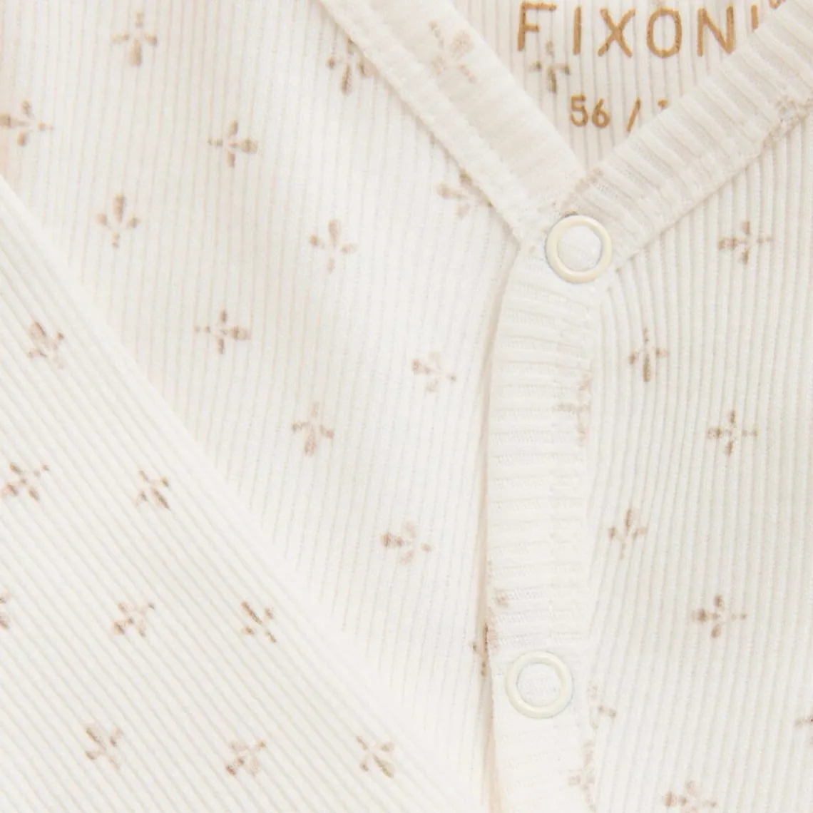 Fin heldragt fra FIXONI med delikat allover-print i blød ribkvalitet. Ærmer og ben kan foldes op, så længden nemt kan justeres efter barnets behov. Heldragten lukkes med trykknapper langs fronten, hvilket gør den nem og praktisk at tage af og på. Materiale: 100% bomuld