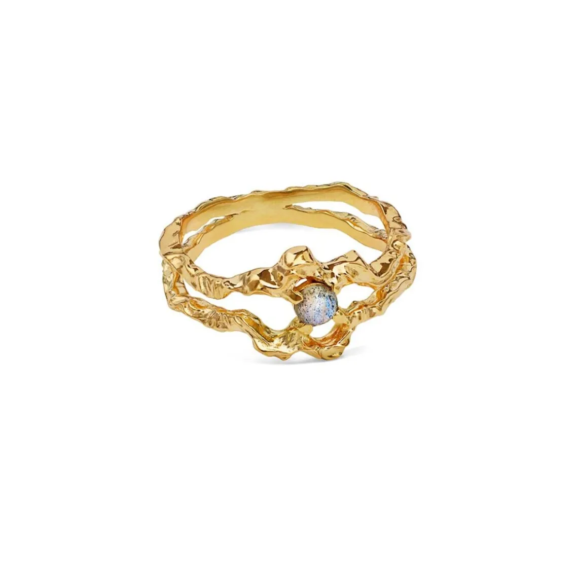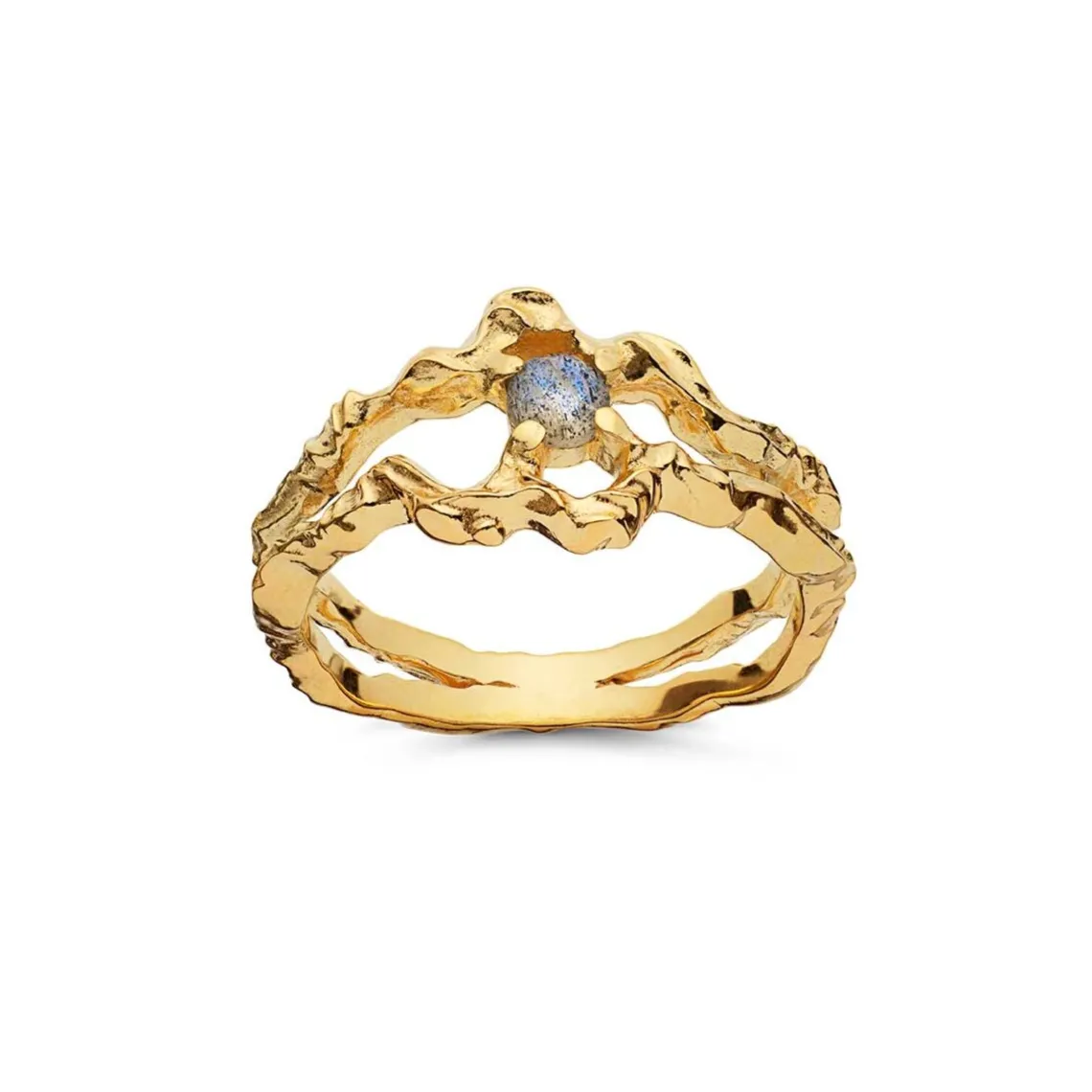Shelly ringen fra Maanesten er en ring med en abstrakt musling, som gemmer på en facetteret labradorit, der skaber kontrast til det organiske udtryk.