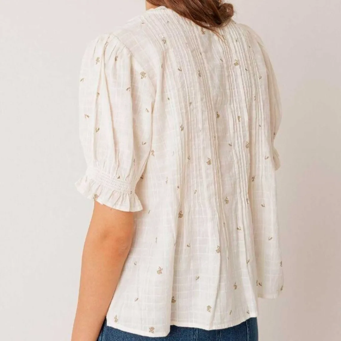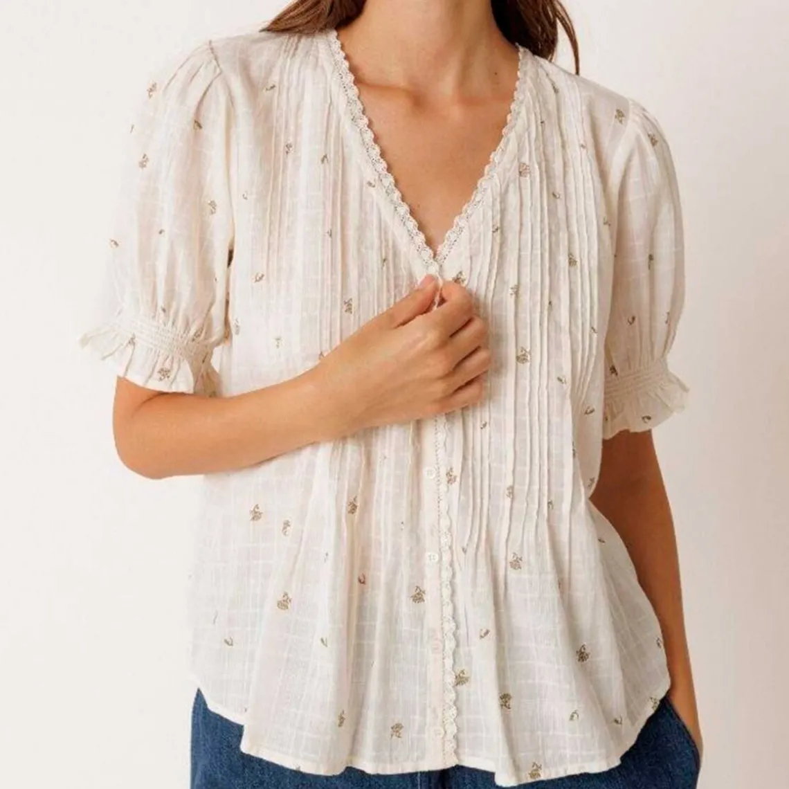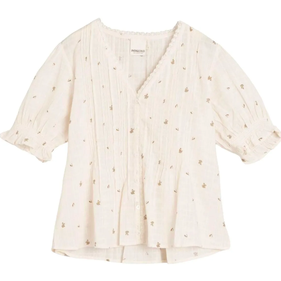 Fin skjorte fra Indi & Cold med diskret mønster, blød bomuld med vævet struktur og blonde detaljer. Skjorten har v-hals og lukkes med små lyse knapper, samt syninger på begge sider af åbningen for en let facon. Ærmerne er korte til albuerne med elastiksyninger, hvilket giver komfort og et feminint look. Materiale: 100% bomuld