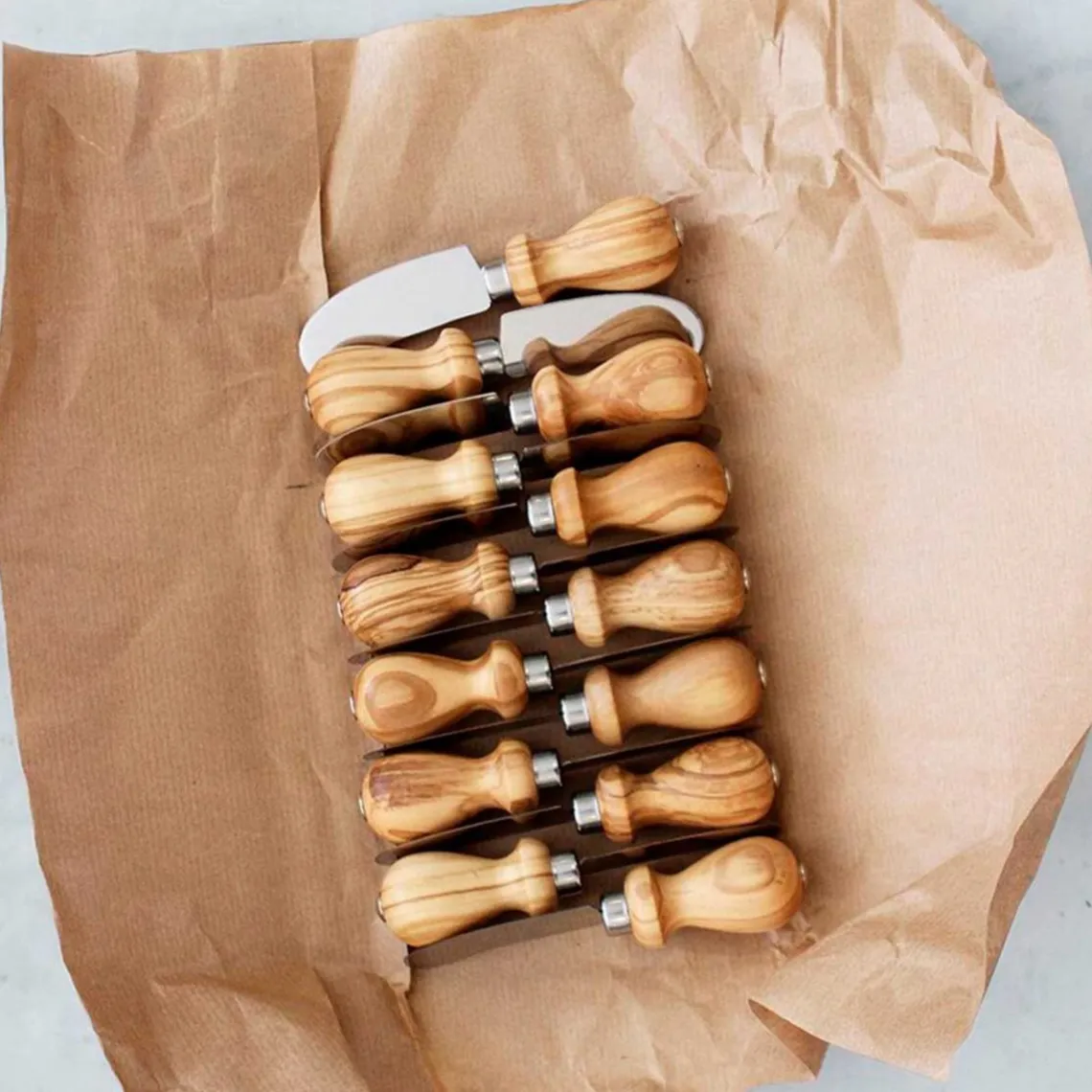 Den er god at holde om og pynter på et veldækket bord. Bladet er i rustfrit stål og skaftet i smukt oliventræ.