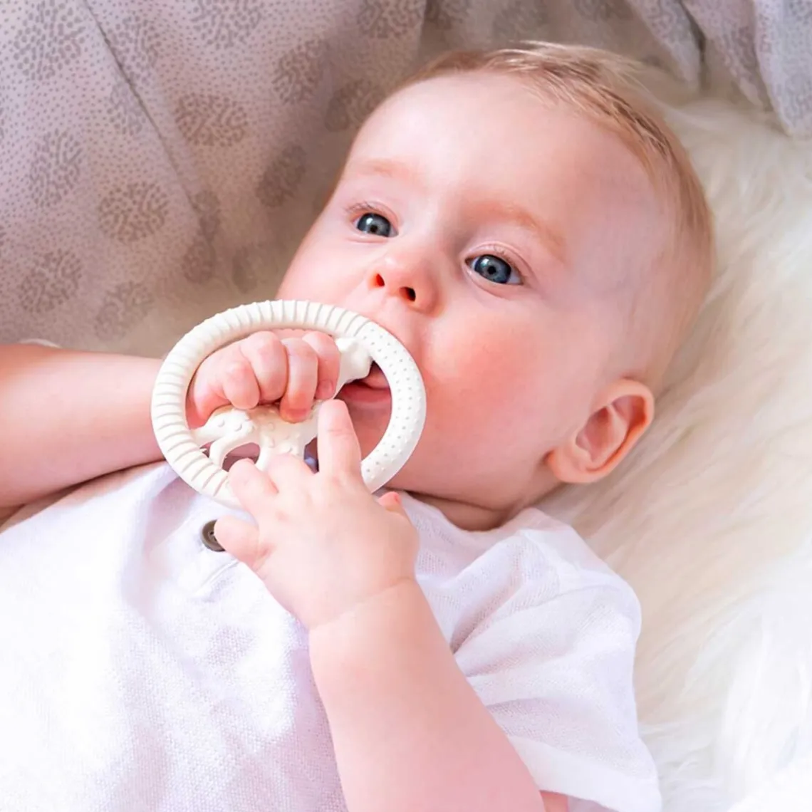 So pure circle bidering fra Sophie la Girafe. Lækker bidering i blød og flekxibel model med mange forskellige overflader og sød Sophie la Girafe i midten. Ringen gør det let for små fingre at gribe fat om den. God til ømme gummer, da de forskellige overflader masserer gummerne blidt.