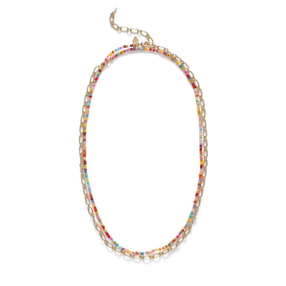 “Vi har sat glæde på en snor! Du tænker måske “Hvordan er det muligt?”. Nå, vi har kombineret dyrebare ting: farverige glasperler og gyldne kæder.“