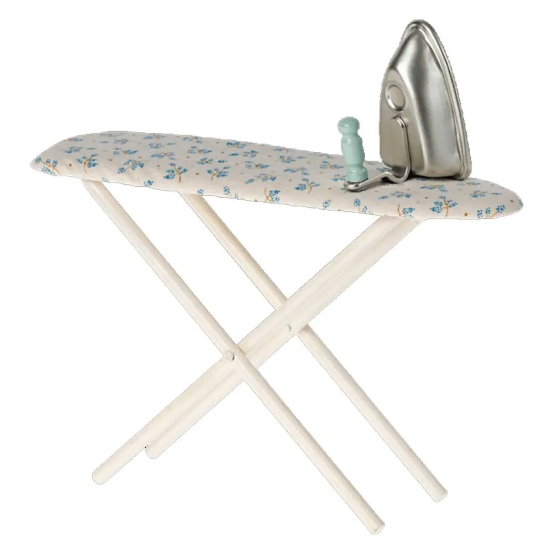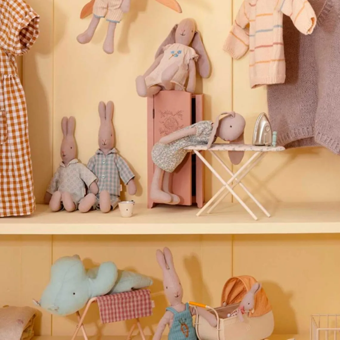 Dette sæt vil gøre legen endnu mere autentisk. Sættet er lavet i metal og strygebrættet er dækket med unikt Maileg stof. Bemærk! Kaniner og tilbehør medfølger IKKE!