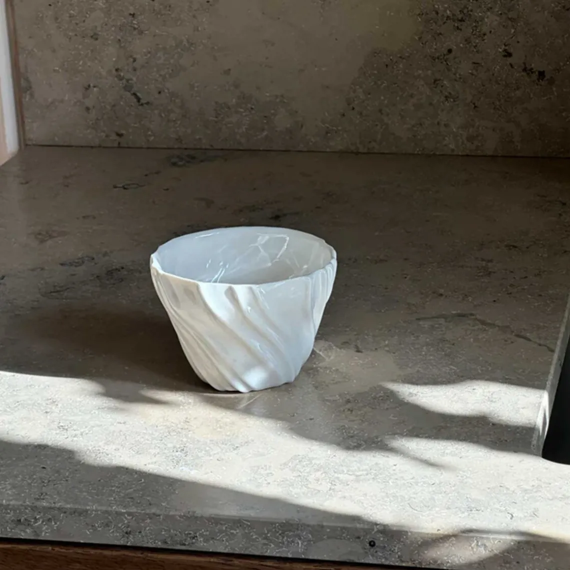Overfladen er inspireret af den bølgede sandbund, som opstår, når vandet trækker sig tilbage og blotter den nøgne havbund – et sanseligt udtryk fra et særligt og foranderligt landskab. Da hver kop er håndlavet, kan der forekomme små variationer, hvilket gør hver enkelt unik. Indhold: 240 ml