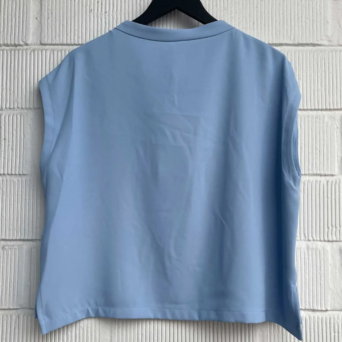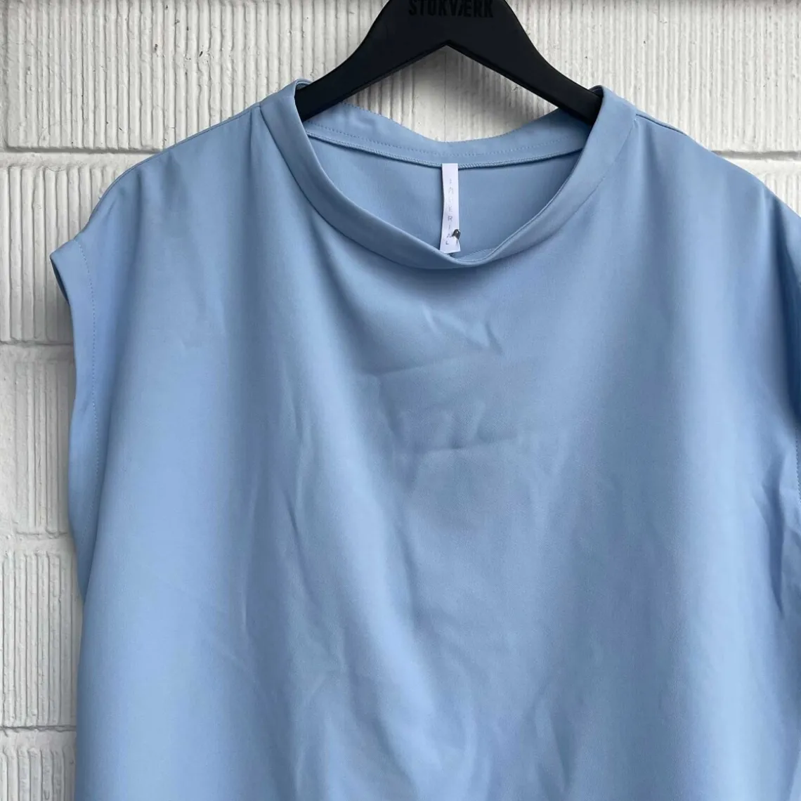 Top fra Imperial i lækkert materiale. Toppen har korte ærmer, som kun lige dækker skulderen og uden skuldersøm. Toppen har et boxy fit. Den har en rund hals med en opretstående kant, som gør den mere speciel. Desuden har toppen et lille slids i begge sider.