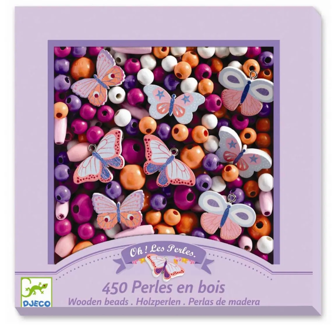 Træperler, Sommerfugle En æske fuld af smukke træperler fra Djeco med temaet sommerfulgle. Træk perlerne på den medfølgende snor og lav dine egne smykker.