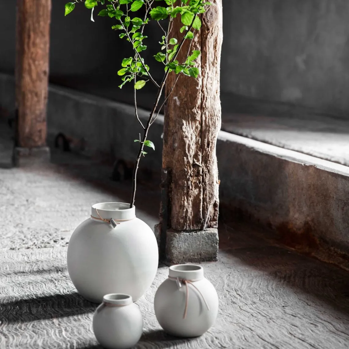 Snitblomster skaber liv og glæde i ethvert hjem. I ERNSTs runde vase i stentøj med læderbånd kan du skabe smukke blomsterarrangementer, der tilfører rummet varme og personlighed. Vasen fås i fire farver: mørkegrå, natur, hvid og rust. Materiale: stentøj