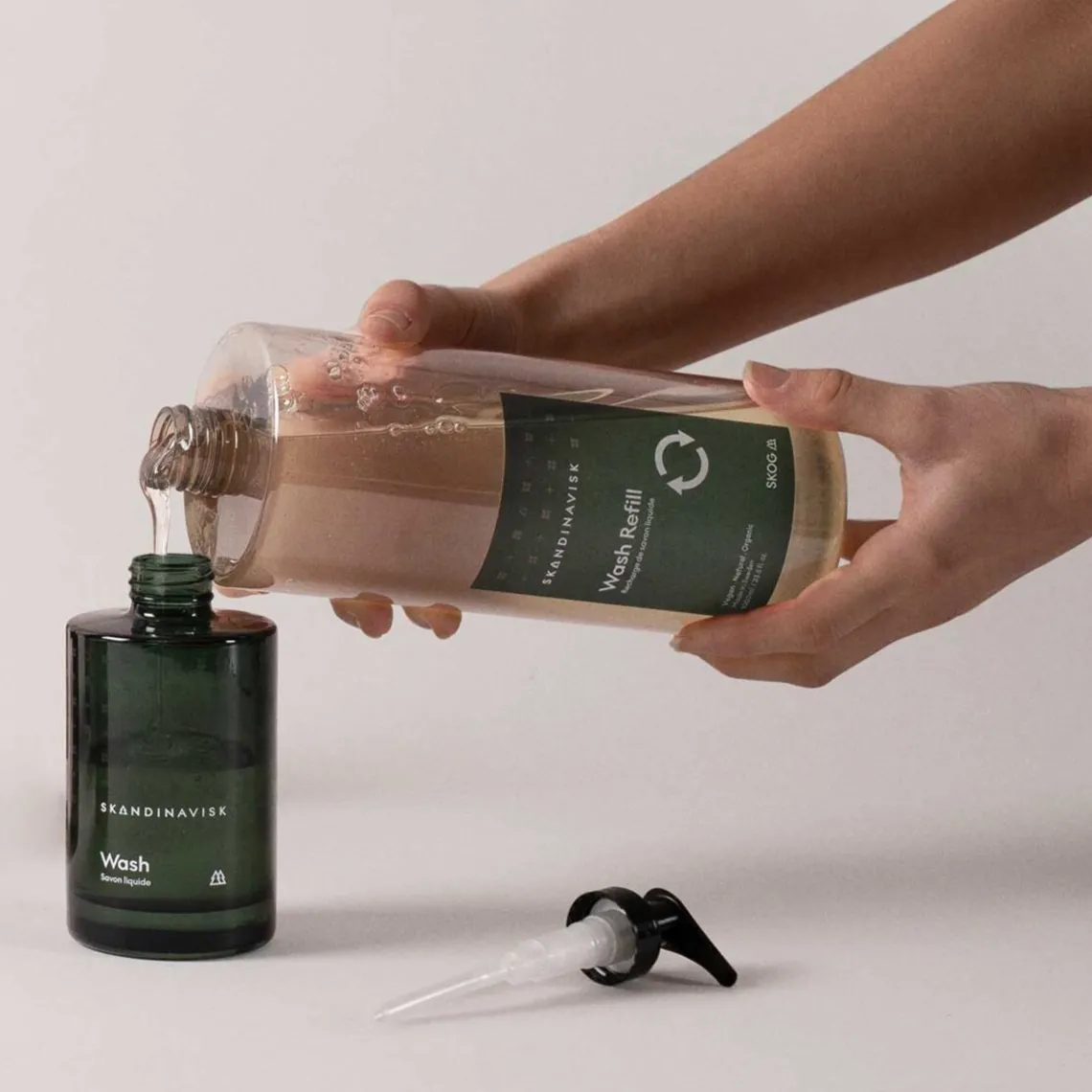 SKANDINAVISK SKOG Wash refill er en beskyttende og fugtgivende hånd-og kropssæbe med økologisk aloe vera og svenske havrefibre, som efterlader huden ren, blødgjort og gennemfugtet. Denne håndsæbe og bodywash er tilsat duftnoter af fyrrenåle, grankogler, birkesaft, og liljekonval. Den indeholder 98% naturlige ingredienser samt 60% certificerede økologiske ingredienser (eksklusiv vand).. Anvendes på fugtig hud; skummes op med en lille smule vand. Er ideel til både hænder og krop