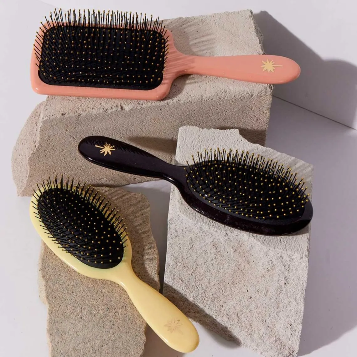 Fan Palm Wet Brush – Fine, faste børstehår med bløde, gyldne spidser, der glider gennem vådt hår og skånsomt løsner knuder uden at skabe brud. Børsterne føles behagelige på hovedbunden og stimulerer cirkulationen, mens den sorte pude fordeler trykket jævnt for en glidende børsteoplevelse. Omhyggeligt fremstillet i Korea og leveres i en smuk gaveæske med guldfolie-detaljer.