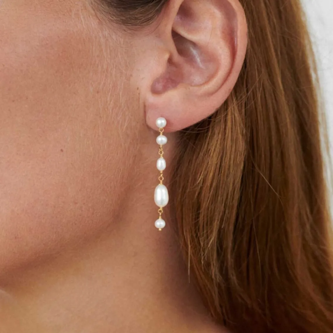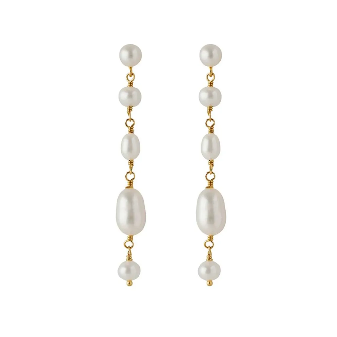 De flotte White Dreams øreringe, designet af Pernille Corydon, er udsmykket med hvide perler i forskellige størrelser og former.