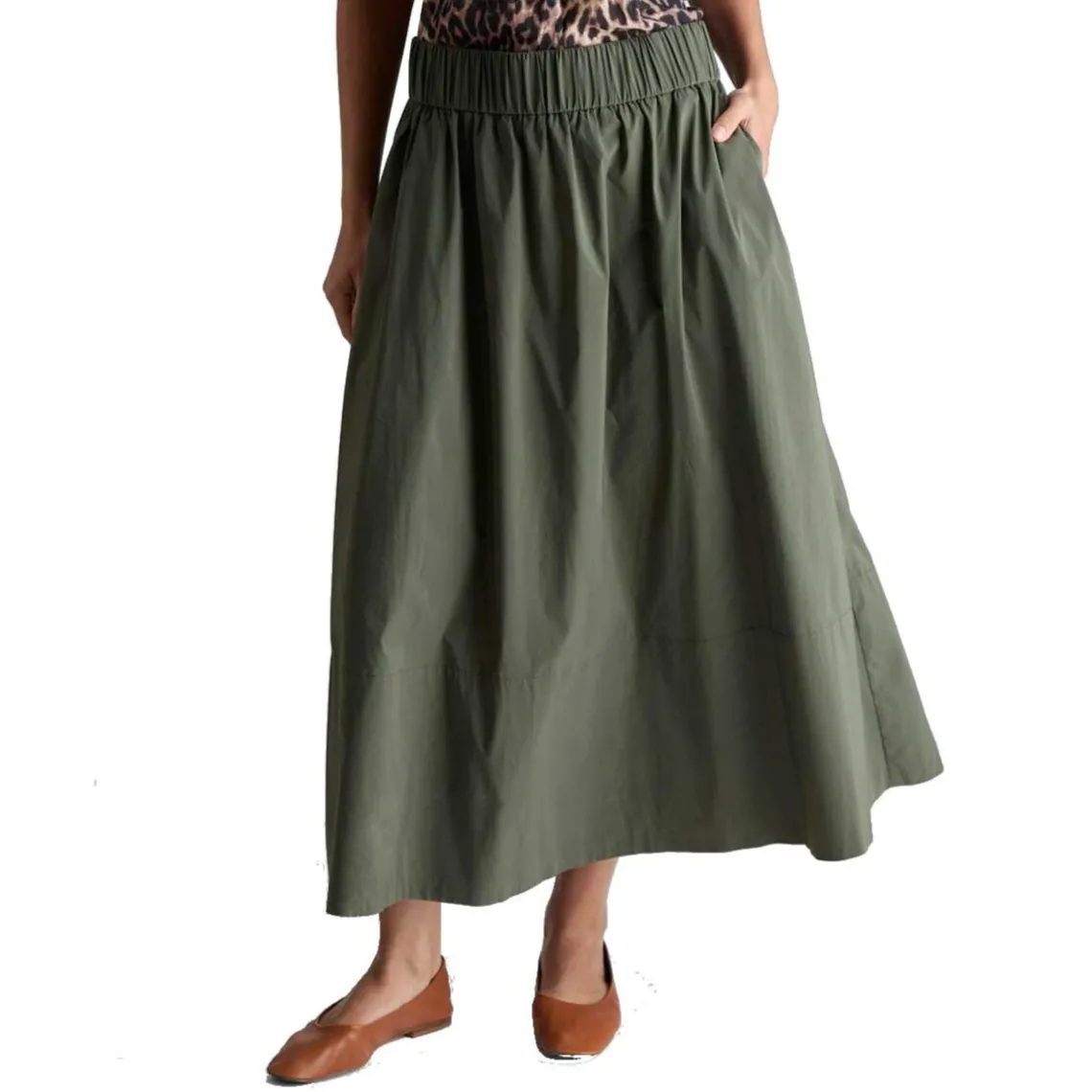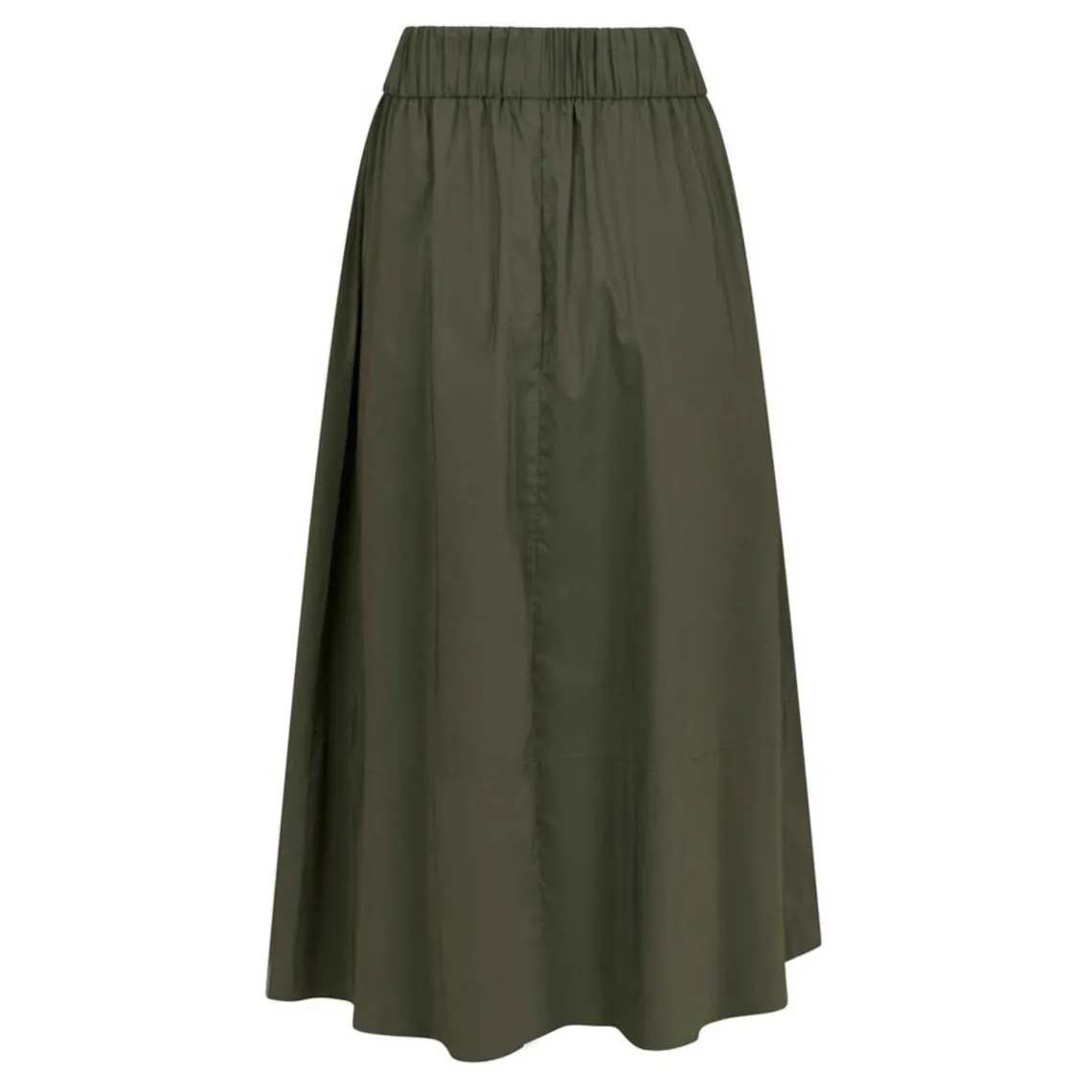 En midi-nederdel i let og struktureret poplin, der kombinerer komfort med klassisk stil. Nederdelen har bred elastik i taljen, diskrete sidelommer og et let vidde skørt, som skaber et feminint og bevægeligt look.