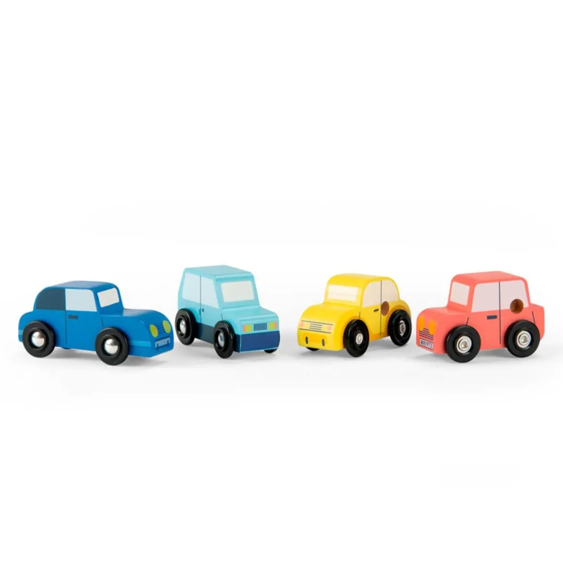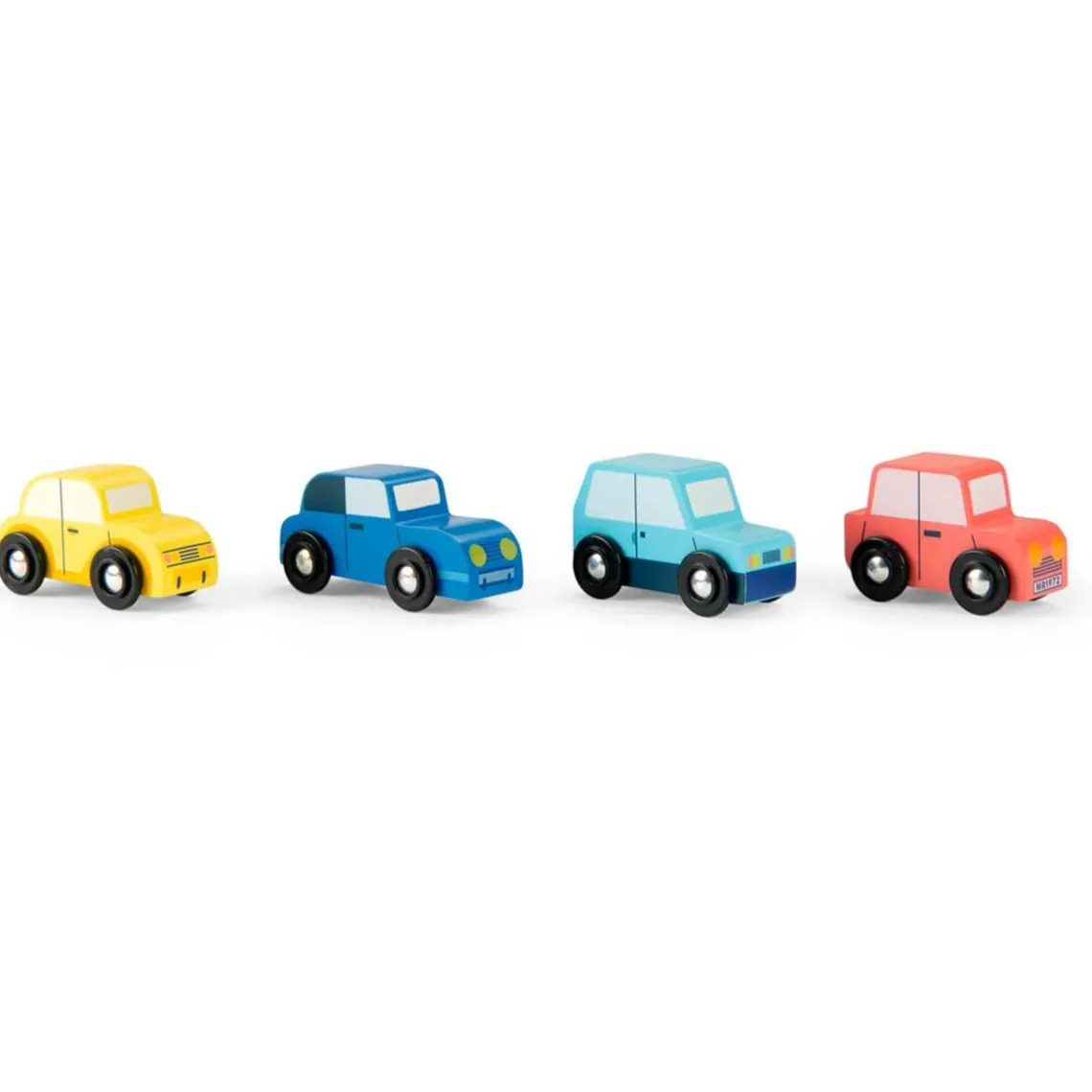 Bilerne er malet med små detaljer og PE- hjulene med aluminiumsakse kører jævnt på enhver plan overflade. Rengøring: Aftørres med en blød, fugtig klud