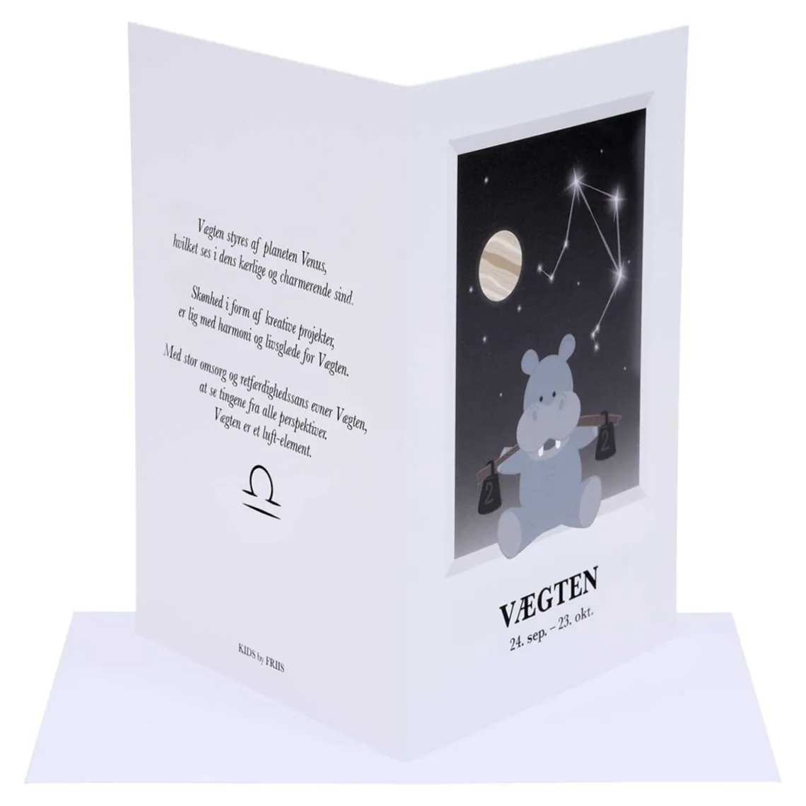 Smukt stjernetegnskort fra Kids by Friis. Kortet kommer i A6-størrelse som et dobbeltkort med tilhørende kuvert – perfekt til dåb, fødselsdag eller som en personlig hilsen. Designet viser det valgte stjernetegn på en fin og dekorativ måde, der gør kortet både betænksomt og dekorativt.