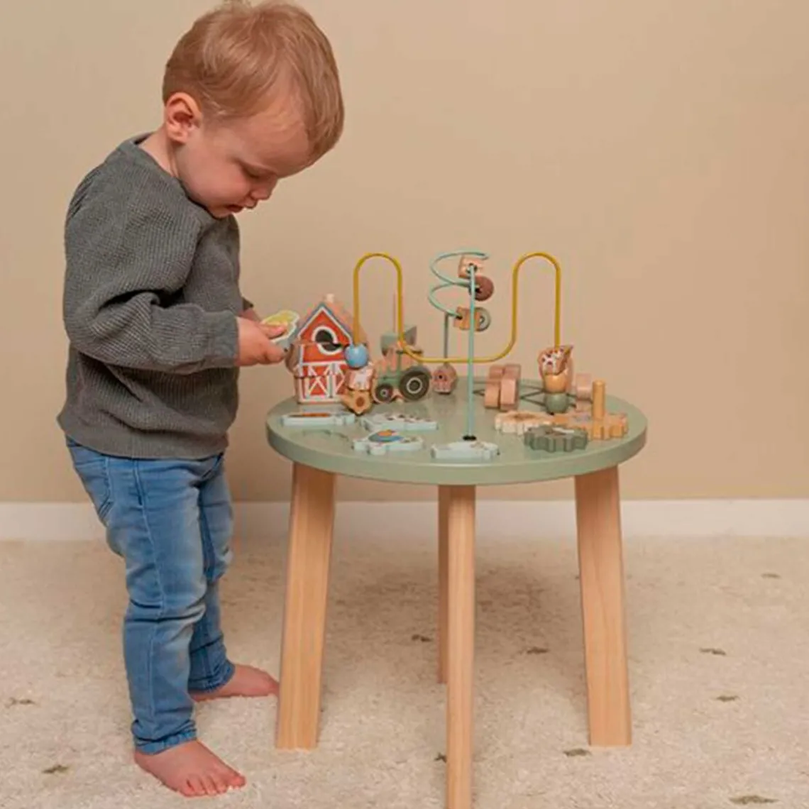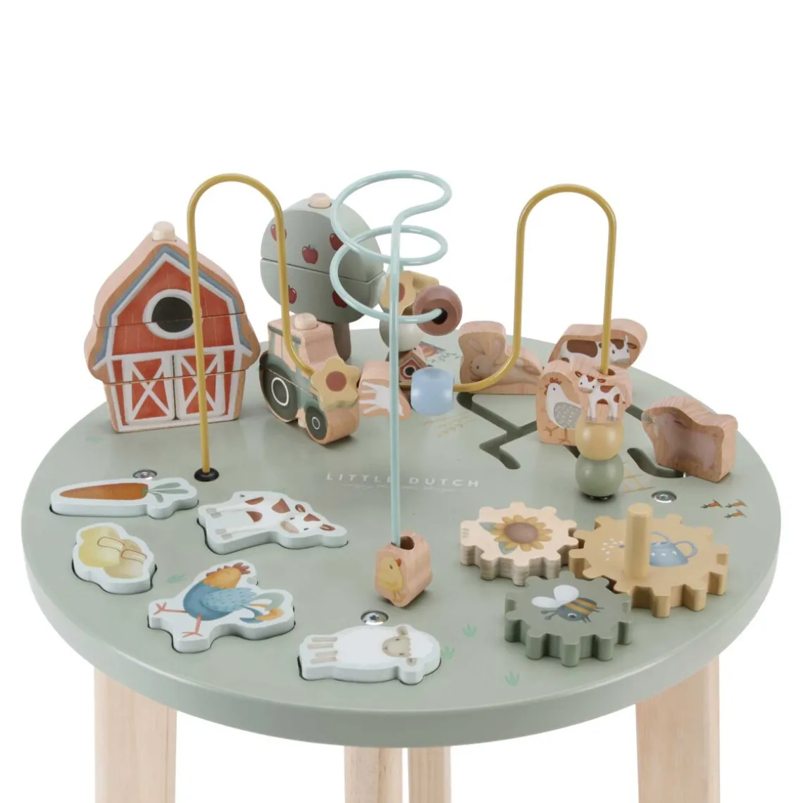 Little Dutch – Aktivitetsbord – Little Farm Rejs ud på eventyr på bondegården med dette fine aktivitetsbord i træ! Her kan de små hænder udforske, dreje, flytte og opdage. Barnet kan føre perlerne gennem spiralen, samle puslespillet, bygge den lille gård, dreje på tandhjulene og lege med de søde dyr – får, køer og høns. Hvert element er designet til at styrke barnets finmotorik og nysgerrighed gennem leg. Det stabile design giver tryg støtte, når barnet står op, og de mange sjove aktiviteter holder legen i gang længe. Voksenmontering er nødvendig.