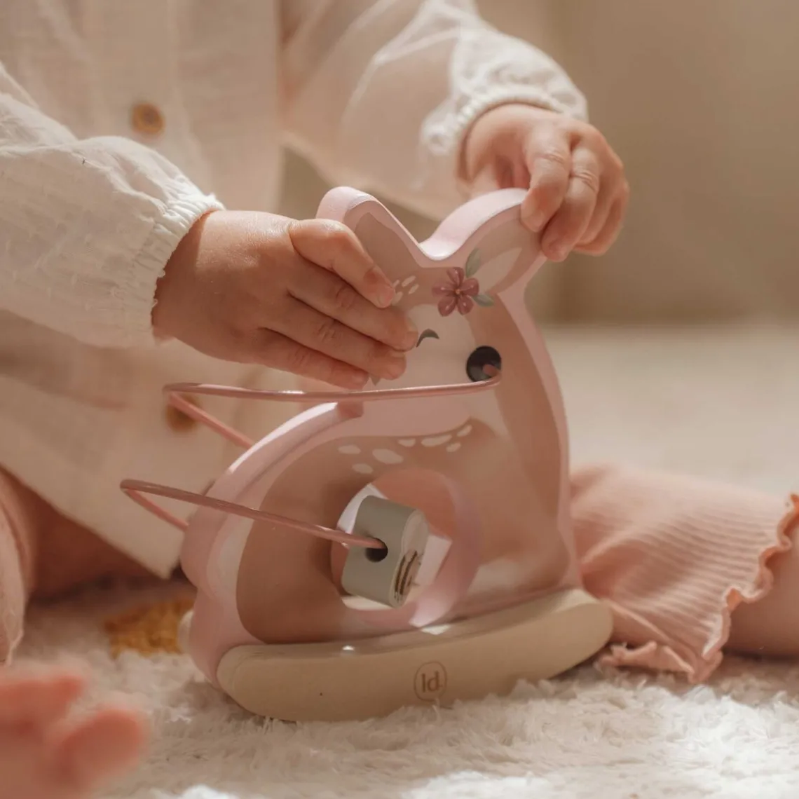 Lad de farverige perler bevæge sig elegant omkring den fine træhjort, mens den vipper blidt fra side til side. Det hyggelige aktivitetslegetøj inviterer til nysgerrig leg og stimulerer barnets finmotorik på en sjov og sanselig måde. Samtidig fungerer det som en dekorativ detalje, der tilfører varme og eventyrstemning til børneværelset. Mål: 16,8 x 8,7 x 16,5 cm
