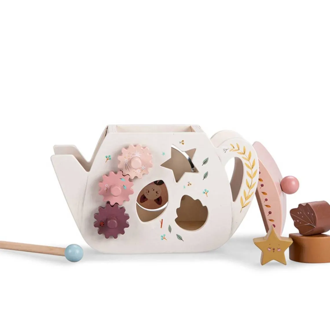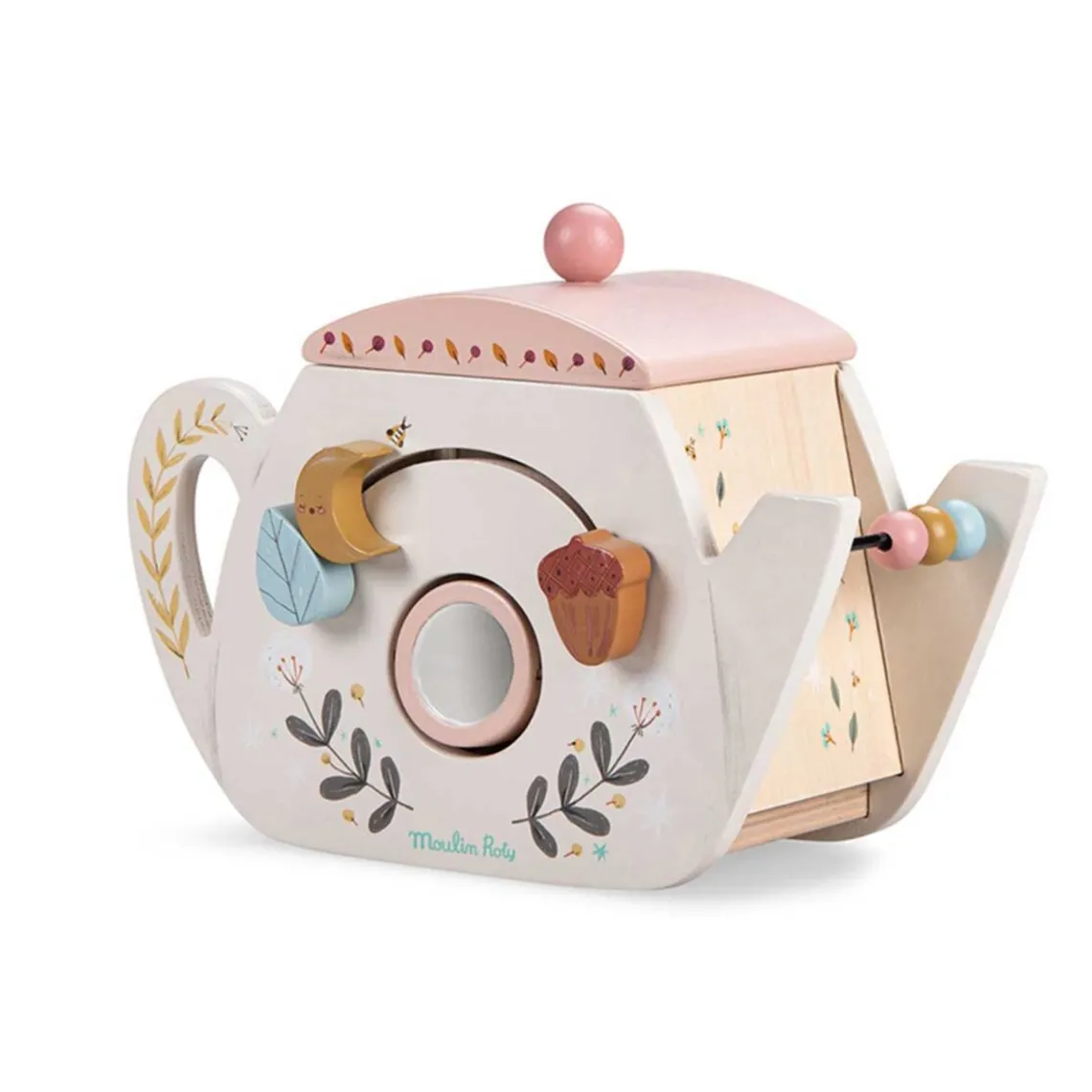 Hver af de 4 sider har sjove aktiviteter at udforske: En kuglerramme, puttekasse, tandhjul til at dreje og en xylofon.