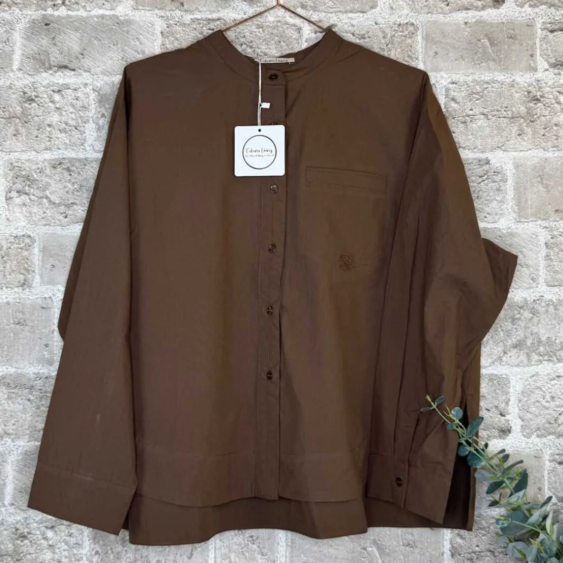 Blød og oversize skjorte i brun farve fra Cabana Living med klassisk krave og knaplukning hele vejen ned. Skjorten har en løs, behagelig pasform og fleksibelt look, der gør den nem at style både åben over en top eller lukket til jeans og nederdele – en alsidig basis i garderoben.