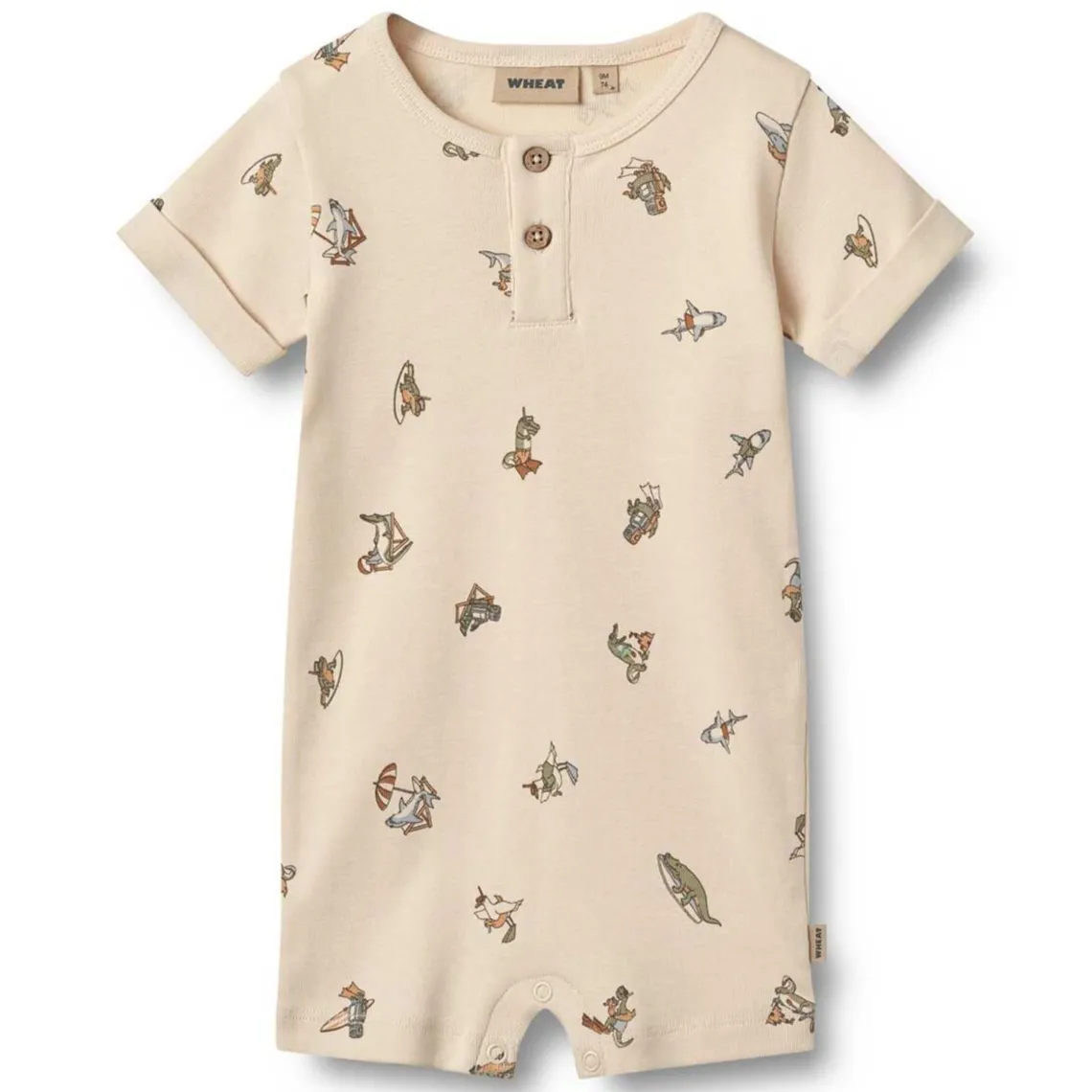 Alfred sparkedragt fra Wheat. Her får du en flot sparkedragt, som kommer i et flot print. Denne sparkedragt er med korte ærmer og korte ben. Sparkedragten har to knapper på fronten, og med trykknapper mellem benene.