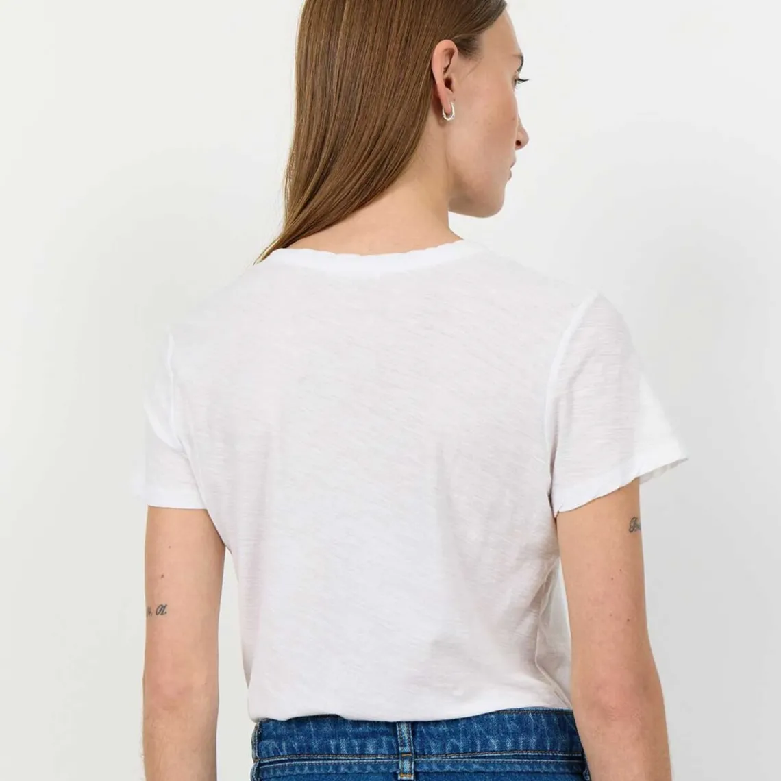 Denne klassiske t-shirt kombinerer tidløs stil med feminin elegance. Den er designet med en smigrende v-udskæring og korte ærmer, hvilket giver et let og sofistikeret look. Det enkle, men effektive design gør den utrolig alsidig og til et must-have i enhver garderobe – perfekt til både hverdagens afslappede look og som basis i et mere opsat outfit.