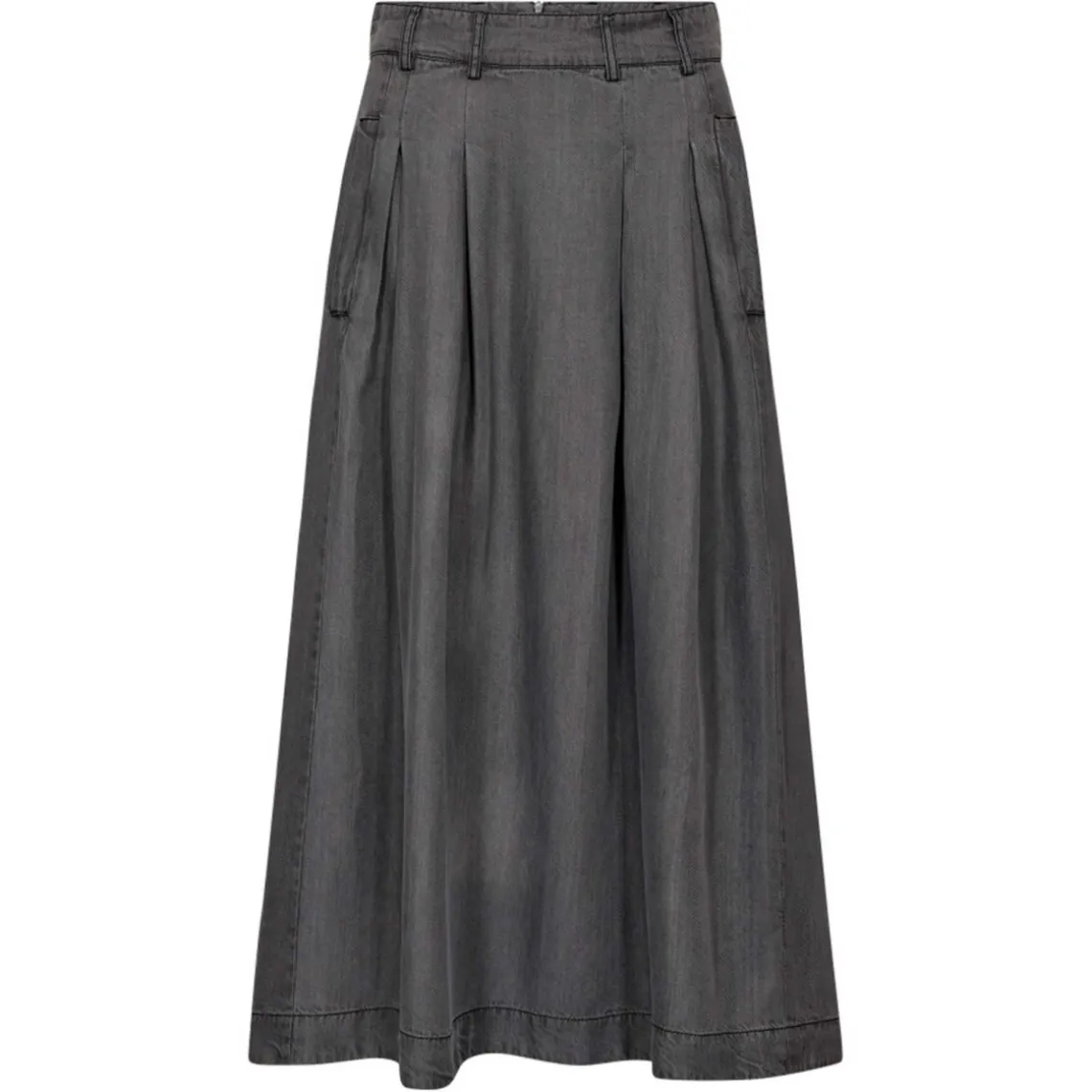 Plisseret nederdel fra CO’COUTURE i mellemgrå, lavet i 100% lyocell. Nederdelen har en høj talje med bæltestropper og fine læg foran og bagpå, som giver elegant volumen og bevægelse. Den falder smukt under knæet og har en løs, behagelig pasform med lynlås- og knaplukning. Materiale: 100% Lyocell