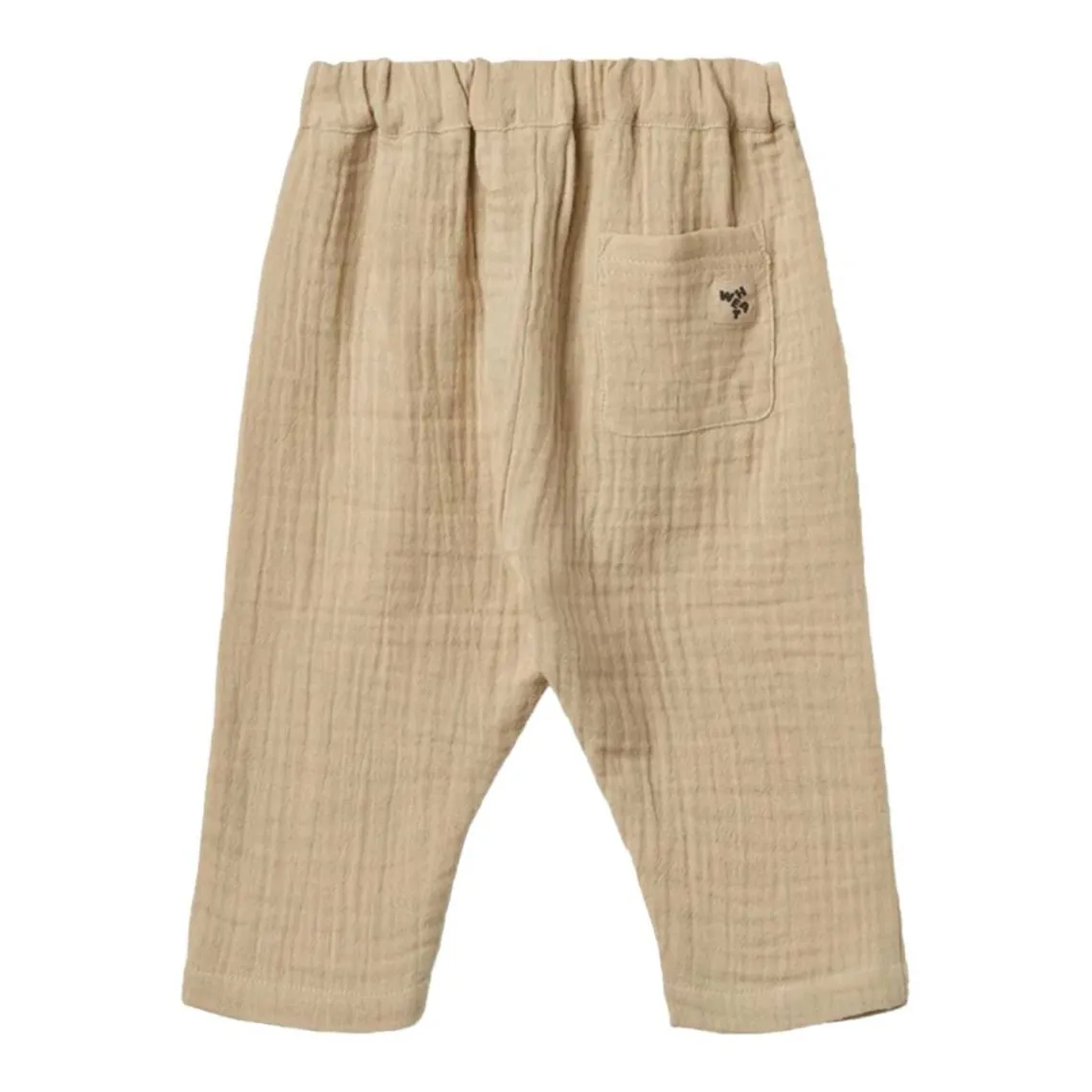 Komfortable Wheat bukser i en varm, beige nuance med en blød musselinstruktur, der skaber et enkelt og elegant udtryk. Bukserne har en elastisk talje, som sikrer en behagelig og justerbar pasform, perfekt til hverdagsbrug. Materiale: 100% økologisk bomuld