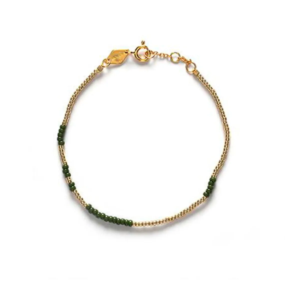 Det klassiske og fine ASYM armbånd fra Anni Lu kan man altid bruge. Perfekt at kombinere med andre fra samme kollektion eller diverse andre armbånd. Dette fås med forgyldte perler og dertil de fine armygrønne perler. Armbåndet er justerbart fra 15,5-18 cm.