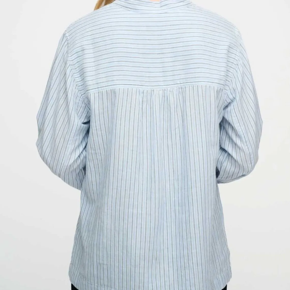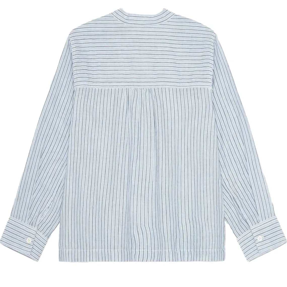 Blåstribet skjorte med rund hals og halv knaplukning foran, der skaber et enkelt og tidløst udtryk. Manchetter med knaplukning ved ærmerne og brystlommer giver både funktionalitet og stil. De diskrete, dekorative læg på rygstykket tilføjer et elegant finish. Vi anbefaler, at du vælger din normale størrelse. Størrelse: Vælg din normale størrelse