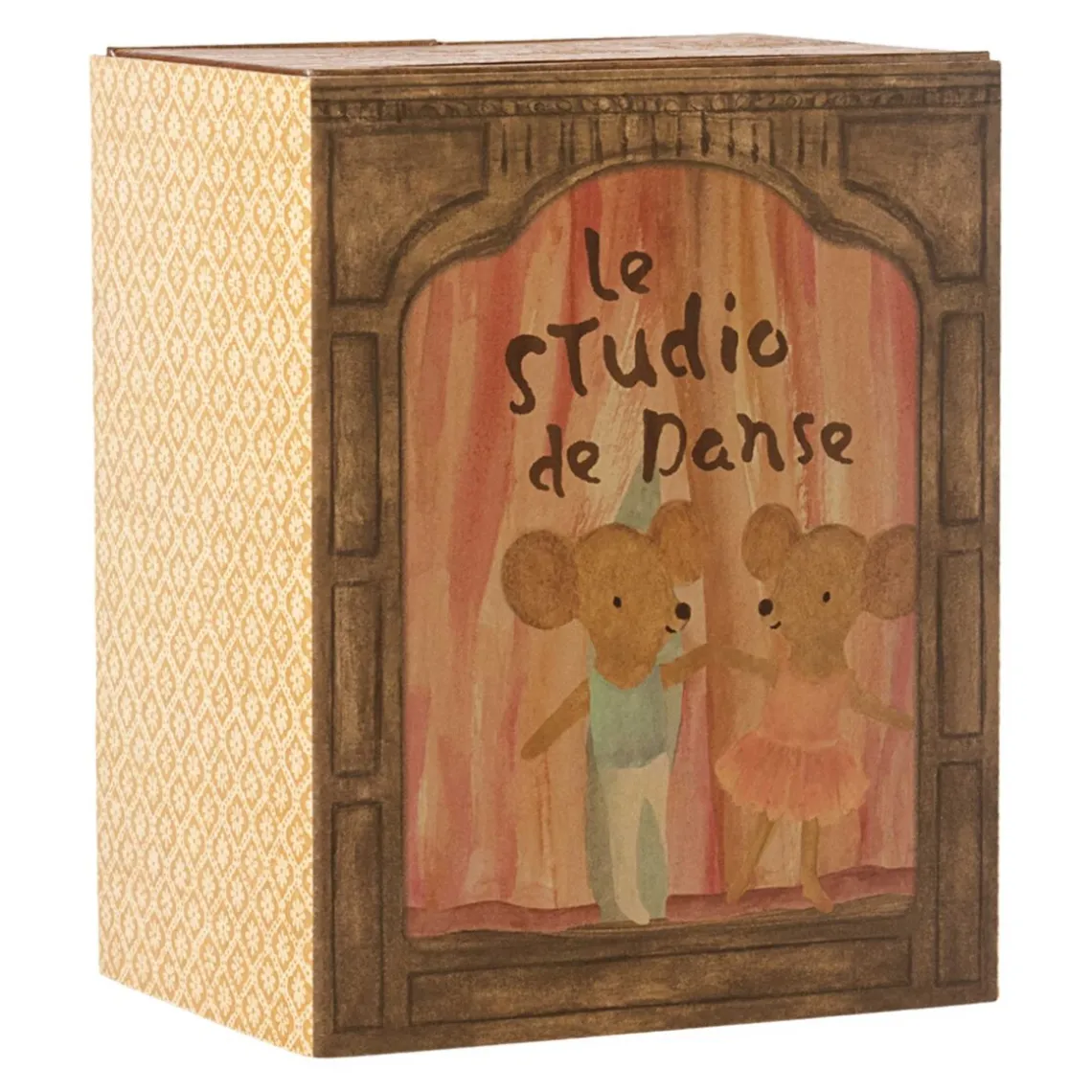 Magisk kasse med dansende mus, der kan bruges som både dansestudie og hyggeligt musehus. Sættet indeholder to påklædte mus til leg og historiefortælling. Materiale: Bomuld, pap