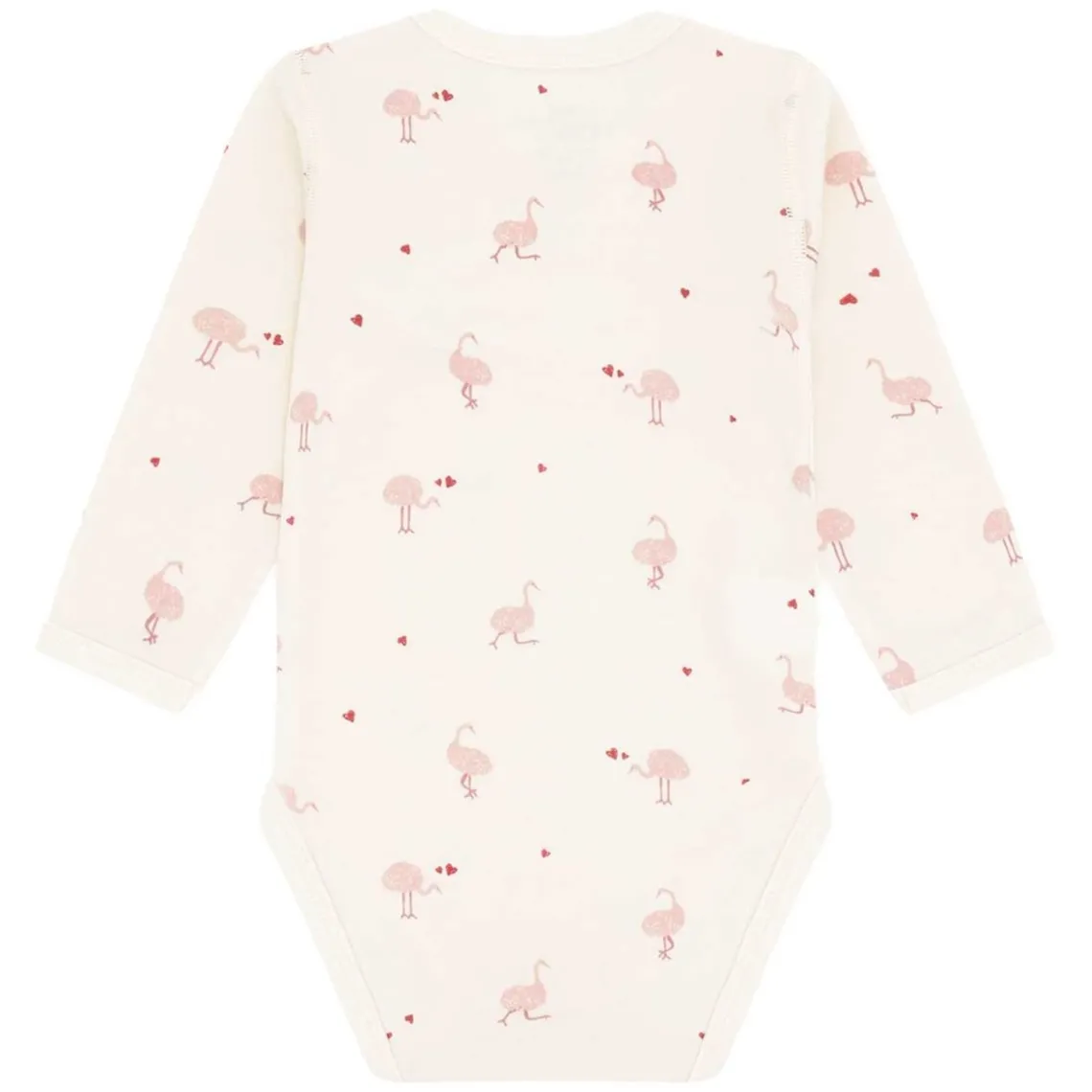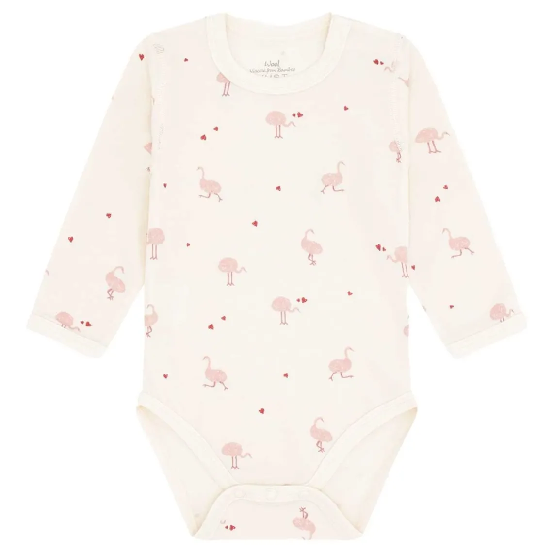 Fin Hust and Claire body i støvet rosa med et sødt print af strudser og små hjerter i rosa og brune nuancer. Bodyen har lange ærmer, en rund halsudskæring med trykknapper ved venstre skulder samt trykknapper mellem benene for nem påklædning. Fremstillet i en blød og behagelig kvalitet af uld og bambusviskose. Materiale: Uld, bambus, polyamid, viskose
