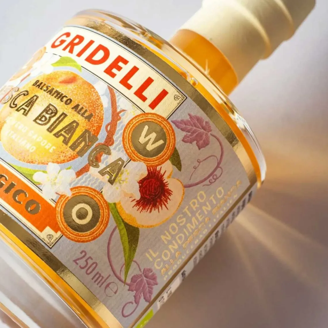 Ingredienser: Økologisk druemost, økologisk hvidvinseddike, økologisk hvid ferskenjuice 10% (økologisk eddike, økologiske hvide ferskner), naturlig hvid ferskenaroma 0,2%. Bedst før: Se etiketten. Opbevaring: Opbevares køligt og mørkt, ikke over stuetemperatur og med proppen på. Kildesortering: Skal sorteres ved kilden som glasemballage.