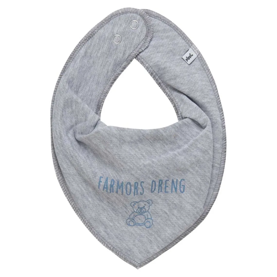Bandana savlesmæk fra Pippi. Her får du en sød savlesmæk med teksten “Farmors dreng” og med en lille bamse under teksten. Denne fine savlesmæk består af to lag, og har en spids form. Savlesmækken lukkes og justeres i nakken, med trykknapper som har to indstillinger.