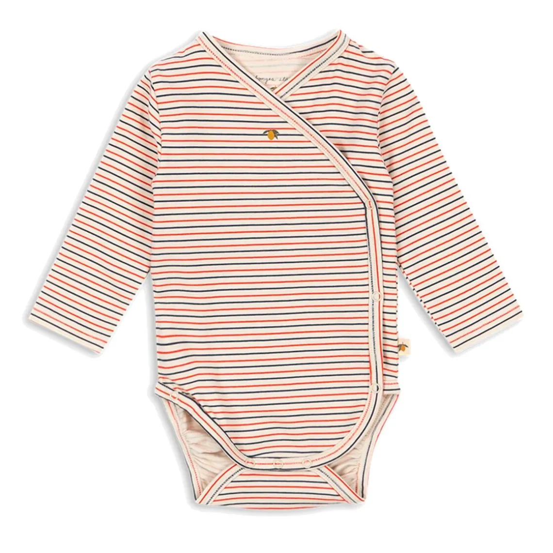 Blød langærmet slå-om body til nyfødte i økologisk bomuld med en smule stretch for en behagelig pasform. Bodyen har trykknapper i siden og i skridtet, hvilket gør det nemt at klæde dit barn på. Materiale: 95% økologisk bomuld, 5% elastan