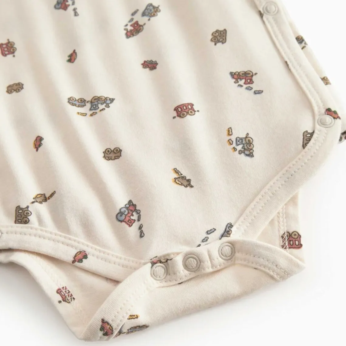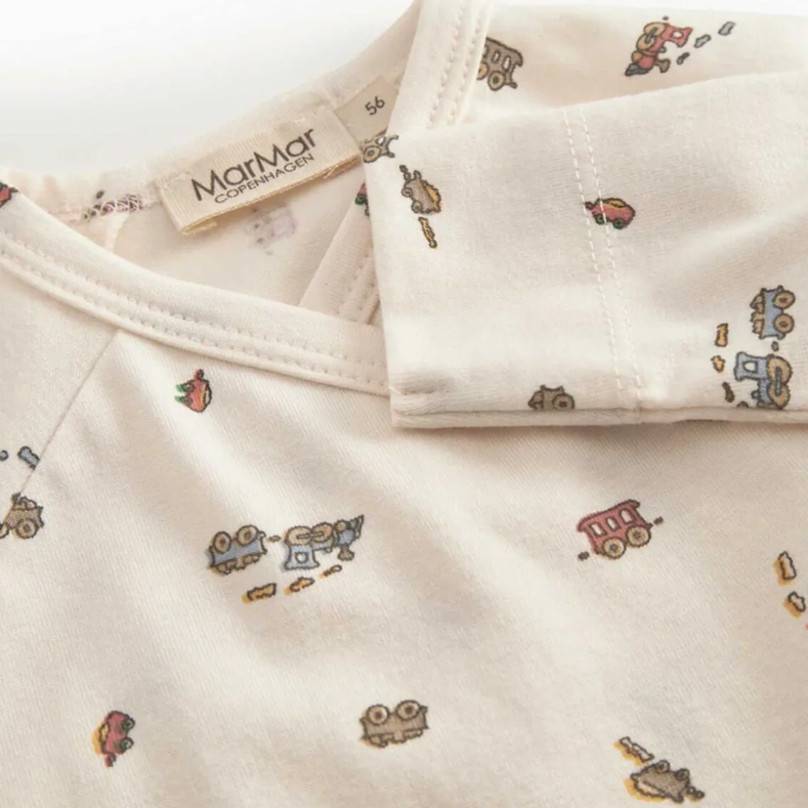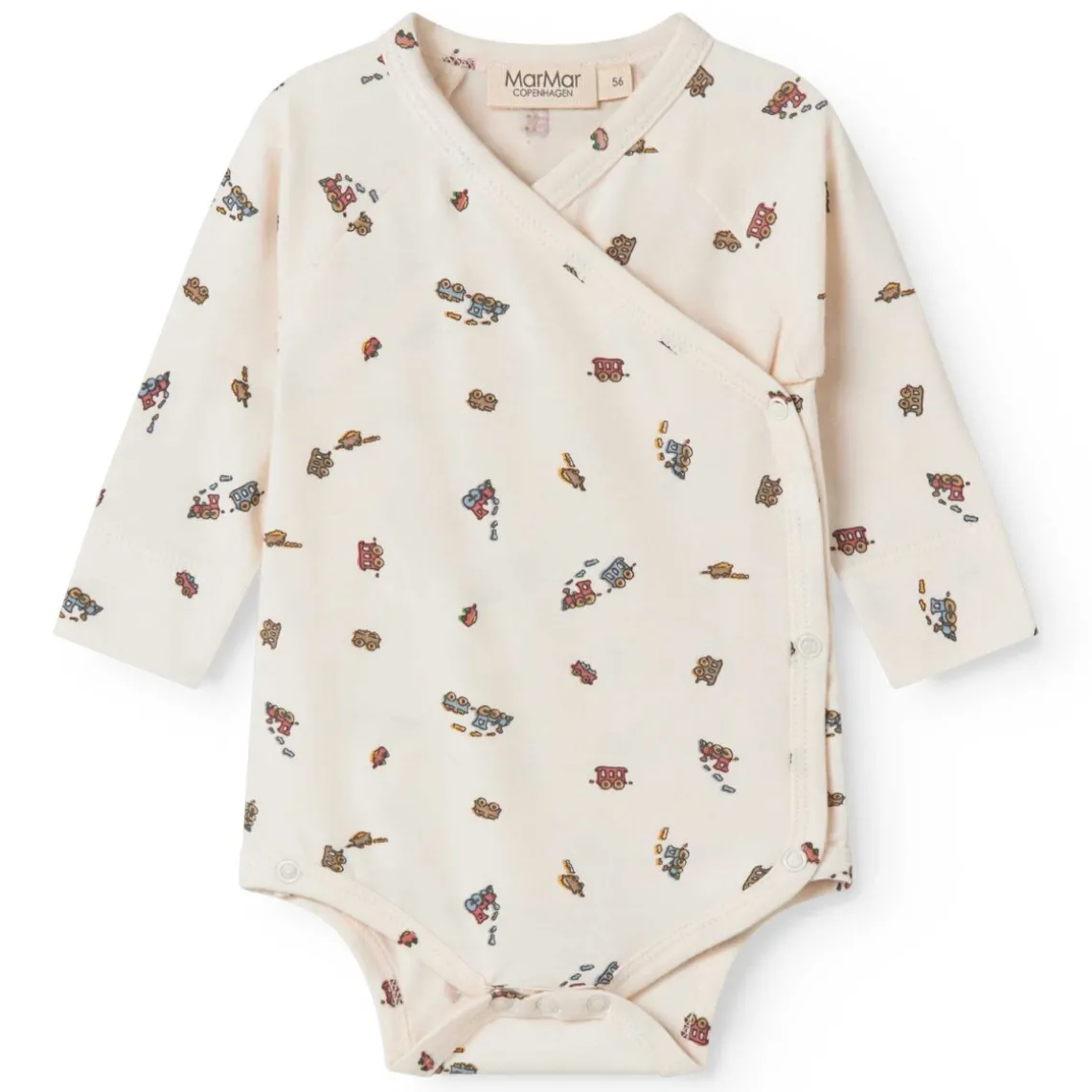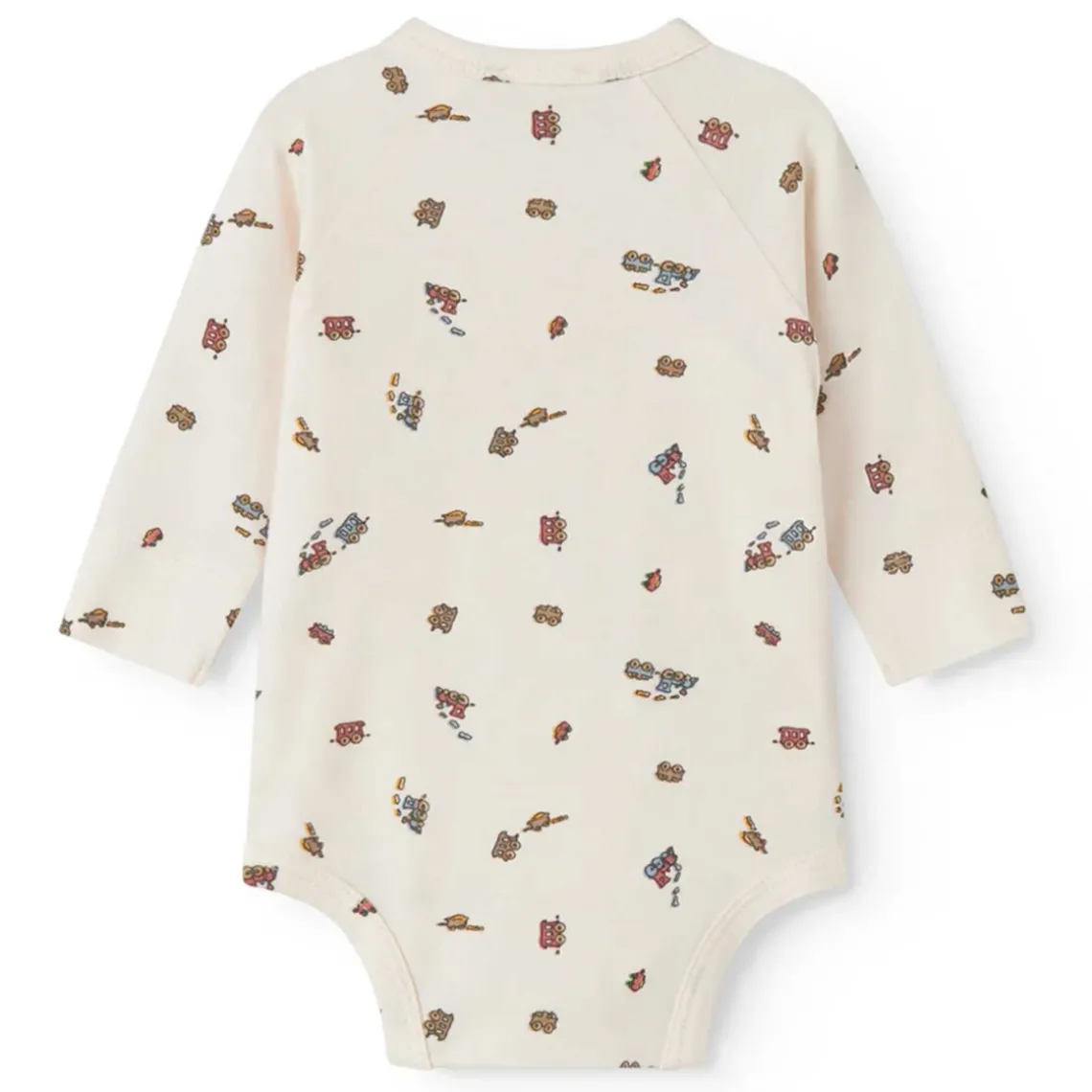 Langærmet bodystocking til nyfødte med slå-om-lukning og sødt print. Den lukkes med trykknapper og er blød, strækbar og behagelig at have på. Materiale: 47% modal, 48% økologisk bomuld, 5% elastan