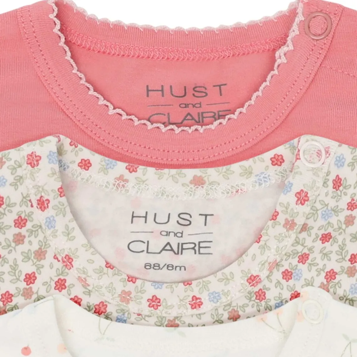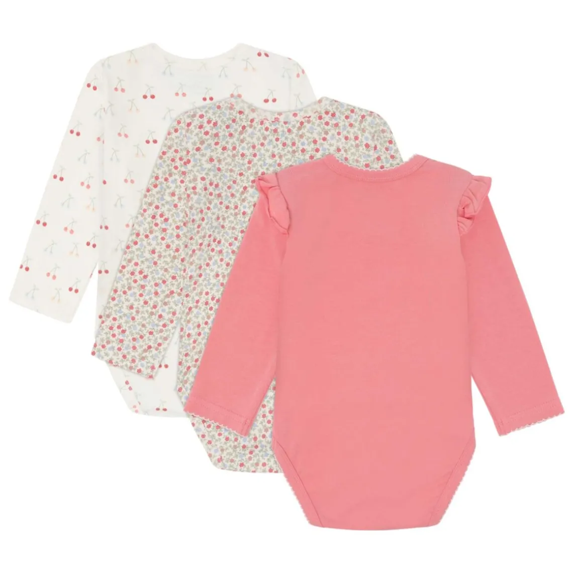 Fine Hust and Claire bodyer solgt i en praktisk 3-pak. Sættet indeholder én ensfarvet mørk rosa body med hvide syninger i kanterne og fine flæser ved skuldrene, én hvid body med et sødt blomsterprint i pink, blå og grøn samt én hvid body med kirsebærprint i rosa, blå og grønne nuancer.