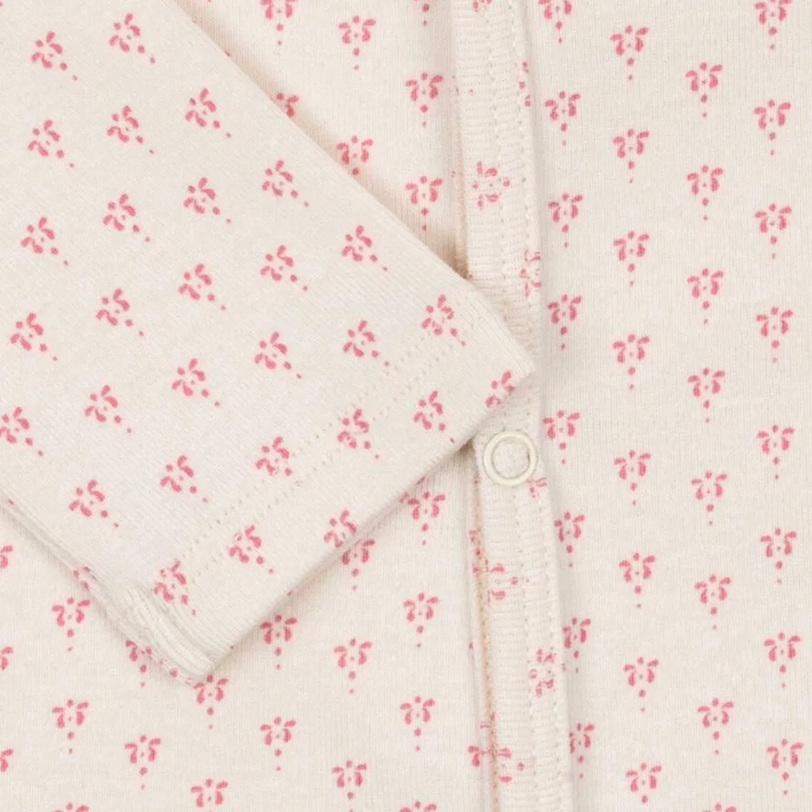Materialet er en bæredygtig blanding af økologisk bomuld og modal med et strejf af elastan, som giver ekstra slidstyrke og fleksibilitet. Modal gør stoffet silkeblødt, åndbart og skånsomt mod den sarte babyhud – perfekt til både søvn og hverdag.