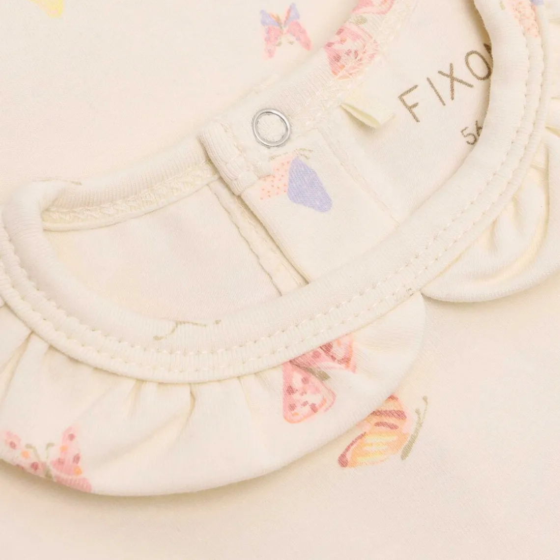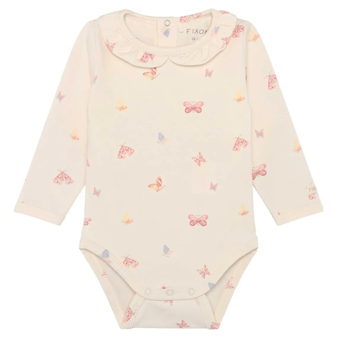 Langærmet body fra FIXONI med fint allover-print i blød og strækbar kvalitet. Bodyen lukkes med trykknapper ved skulderen og mellem benene, hvilket gør den nem at tage af og på og sikrer en behagelig pasform hele dagen. Materiale: 95% bomuld, 5% elastan
