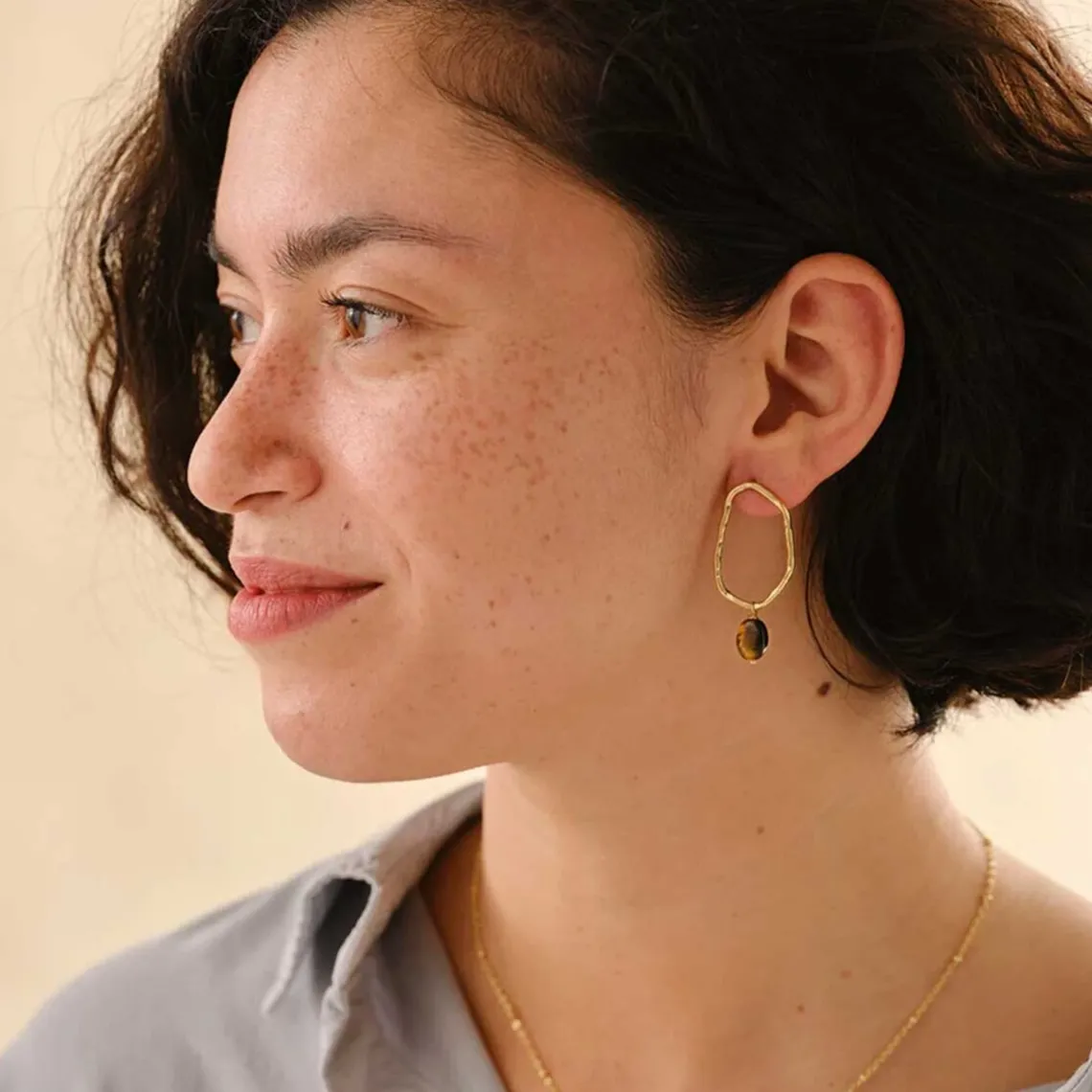 Med Bravery Tiger Eye øreringene kan du style ethvert outfit. Øreringene er lavet af guldbelagt messing og prydes af ovale tigerøje-ædelsten. Tigerøje hjælper dig med at stå fast med begge fødder på jorden.