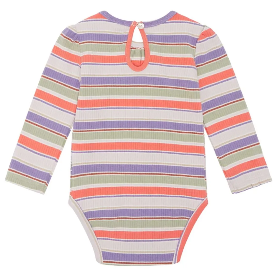 Britt bodystocking fra Hust and Claire. Denne bodystocking kommer i et flot stribet print, i smukke farver. Bodystockingen er med lange ærmer, som afsluttes med en lille flæsekant, og den lukkes med trykknapper mellem benene og enkelt knap i nakken.