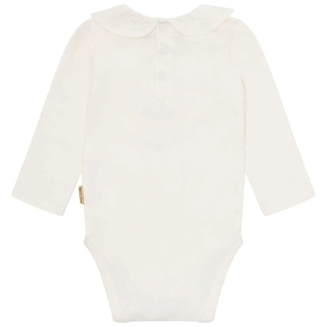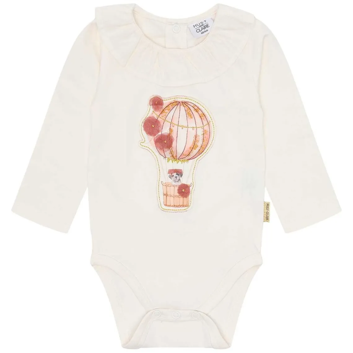 Elegant Hust and Claire body i en lys cremefarve med lange ærmer. Fronten er pyntet med et smukt motiv af en luftballon med en hund samt fine blomsterapplikationer. Den runde halsudskæring med rynket kant giver et sødt og elegant udtryk. Bodyen lukkes praktisk med trykknapper i bunden, og de enkle ærmekanter sikrer behagelig pasform og god komfort. Materiale: 95% økologisk bomuld, 5% elastan