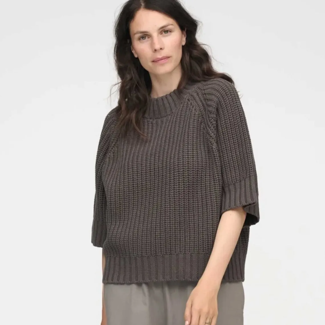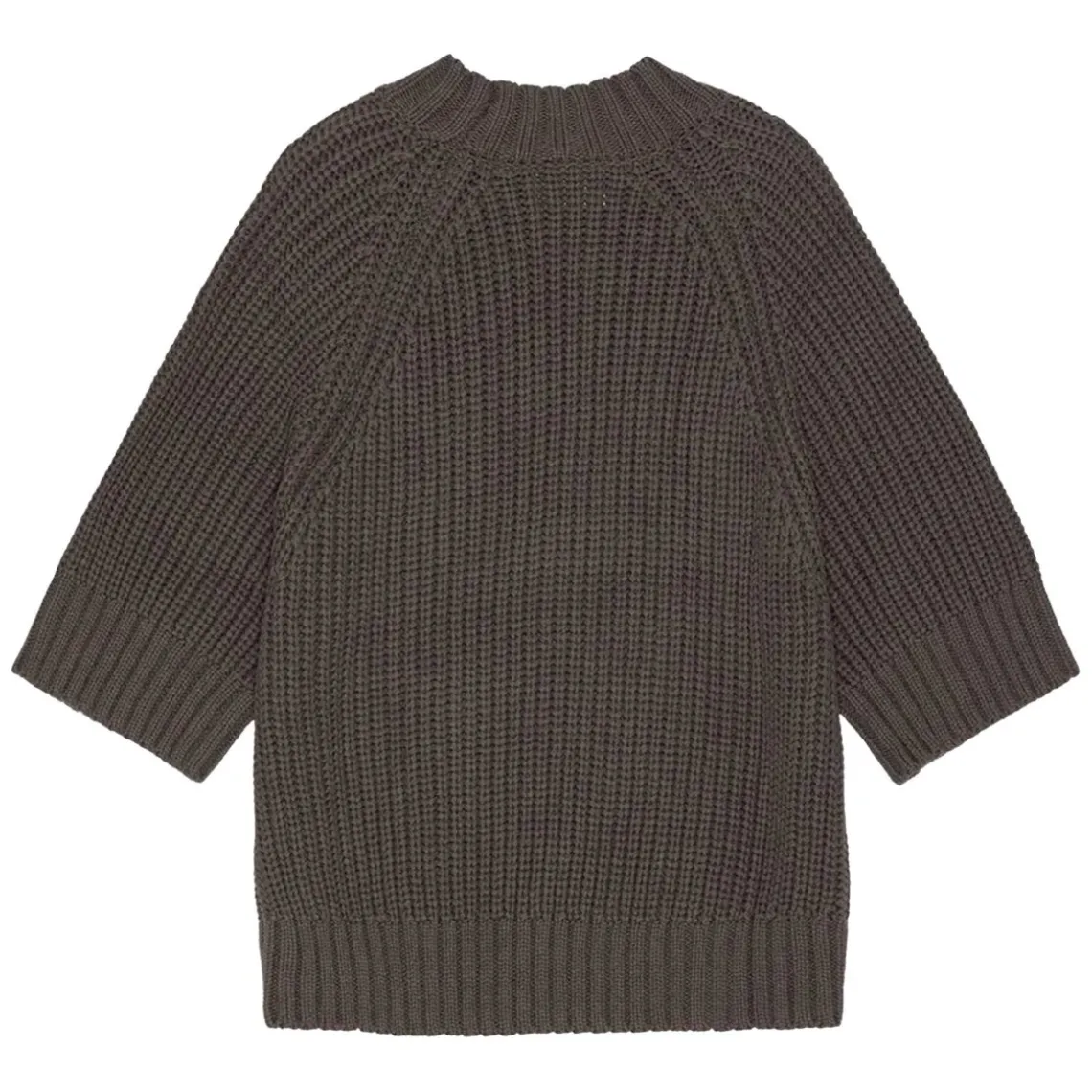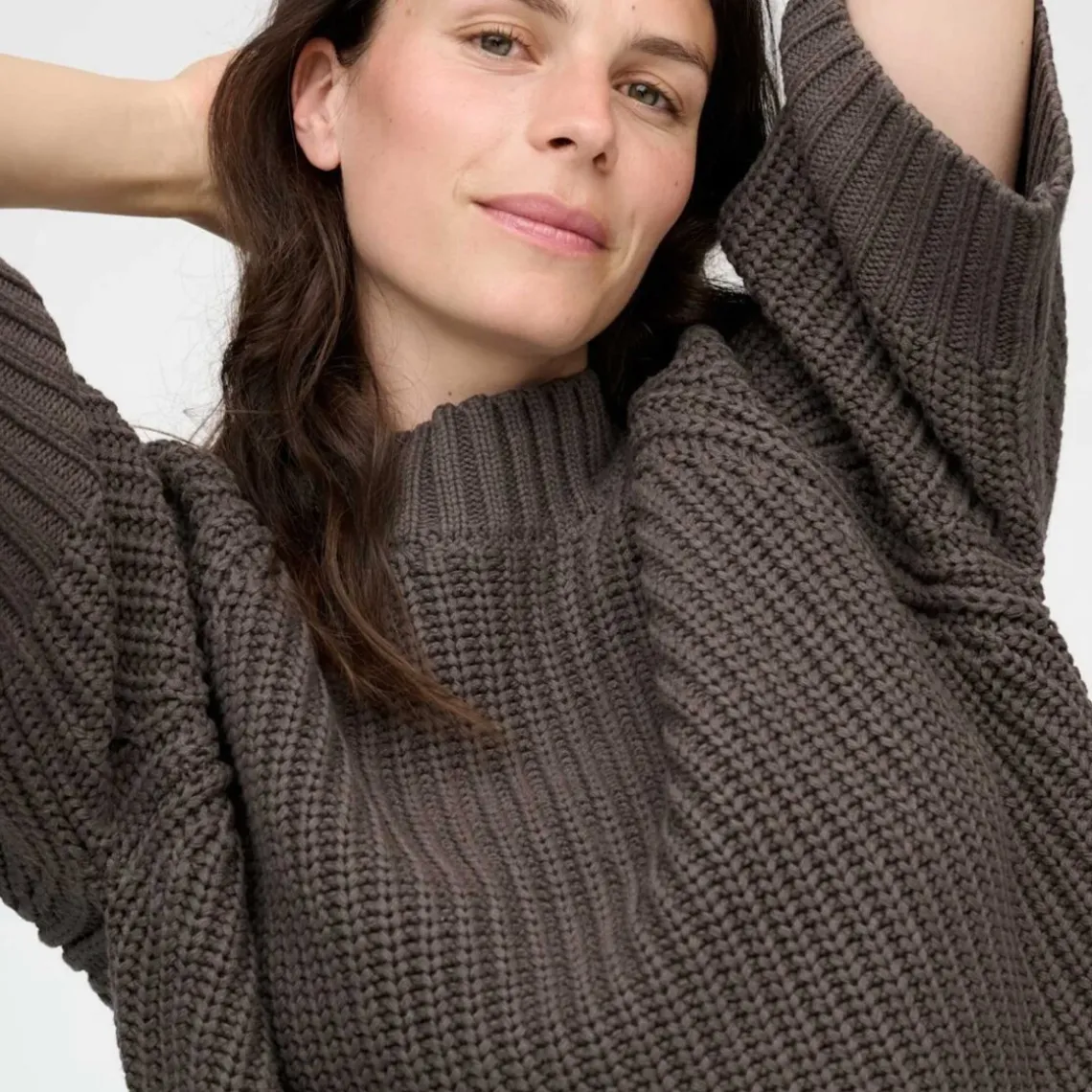 Brun, chunky strik med rund hals og voluminøse ¾-lange ærmer, der giver et moderne og afslappet udtryk. Sweateren er designet med dekorative, grove ribkanter ved manchetter og søm, som tilfører struktur og karakter til det bløde strikdesign. Materiale: 69 % økologisk bomuld, 40 % akryl