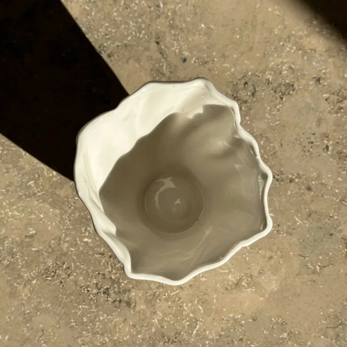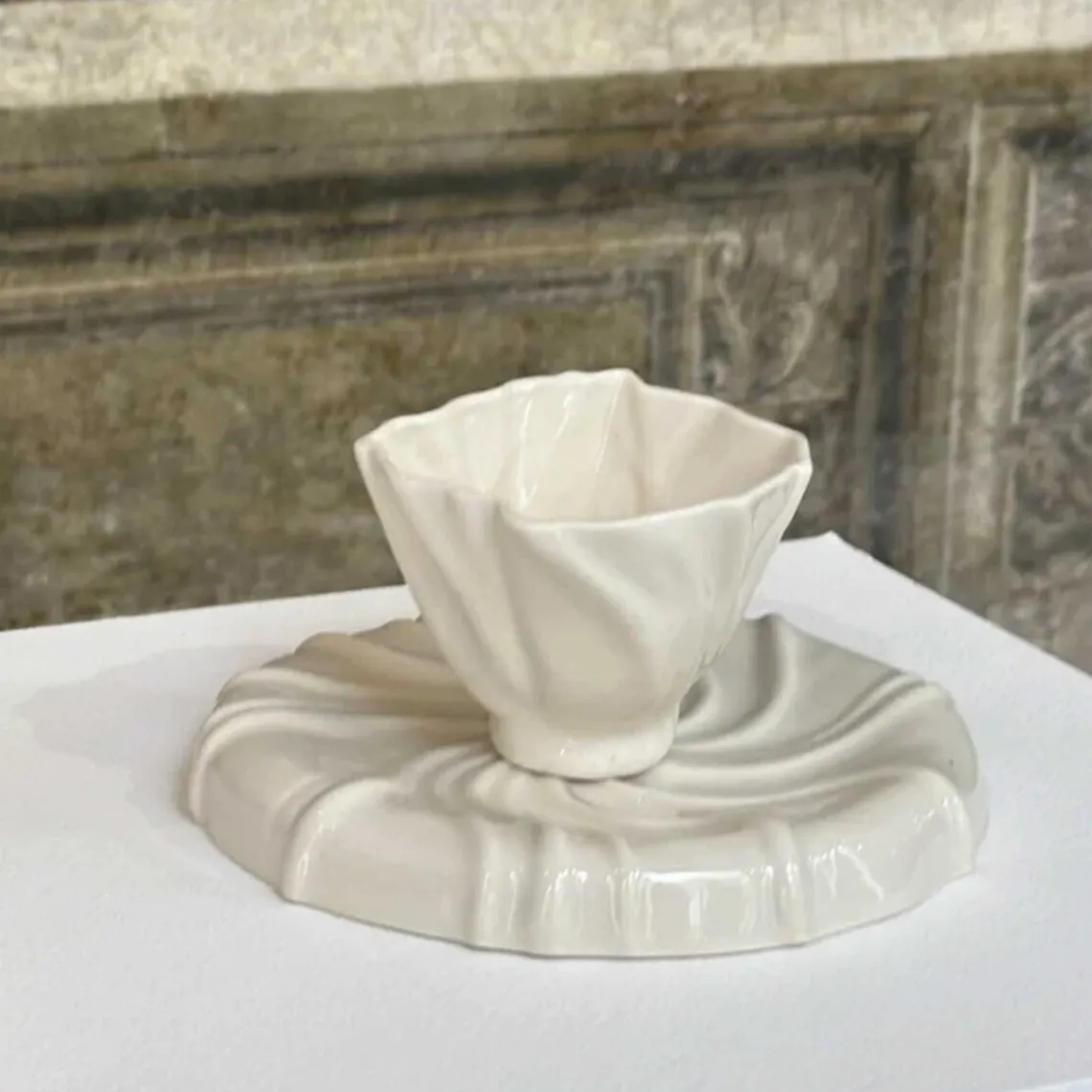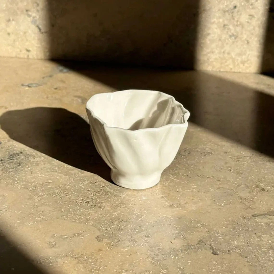 Cortadokop fra Atelier Marée. Koppen er håndlavet i det fineste hvide porcelænsler og har samme sanselige overflade, inspireret af den bølgede sandbund, når vandet trækker sig tilbage og blotter havbunden.