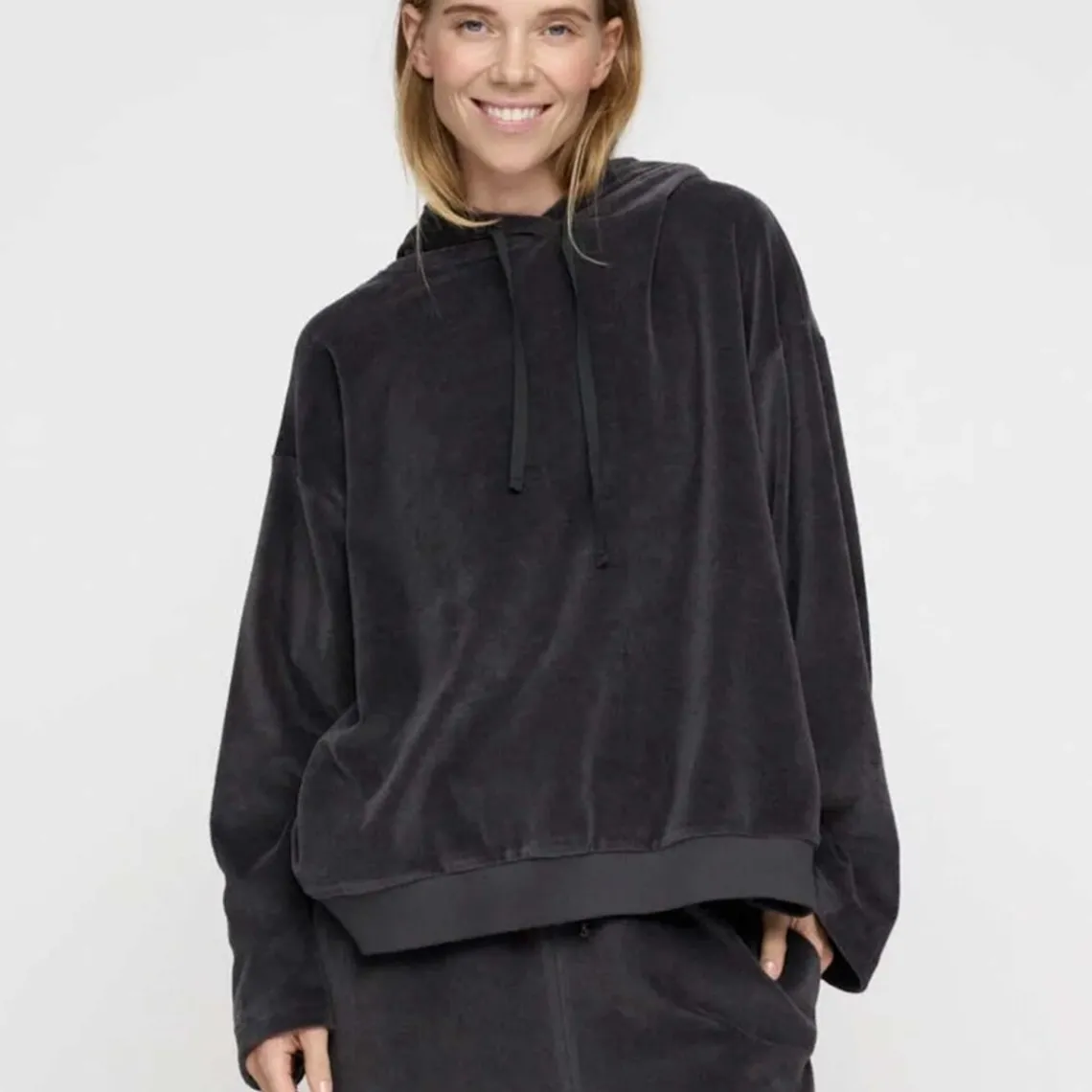 Langærmet, mørkegrå bluse med hætte, brede ærmer og snører. Designet med dekorative slidser i siderne, der giver et afslappet udtryk. En fin basisstyle til både hverdag og blød bevægelse. Materiale: 100% bomuld