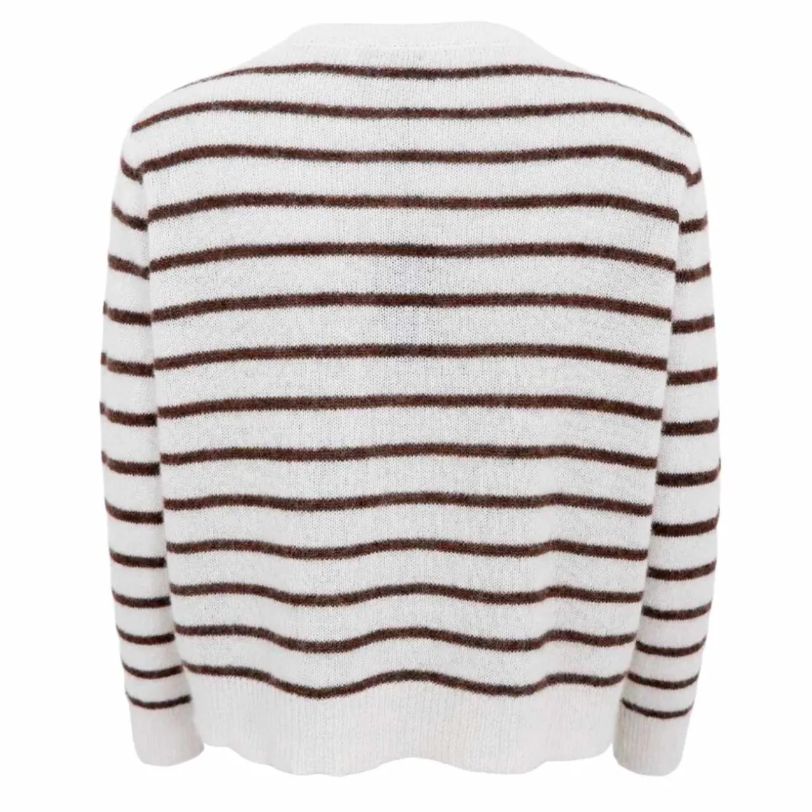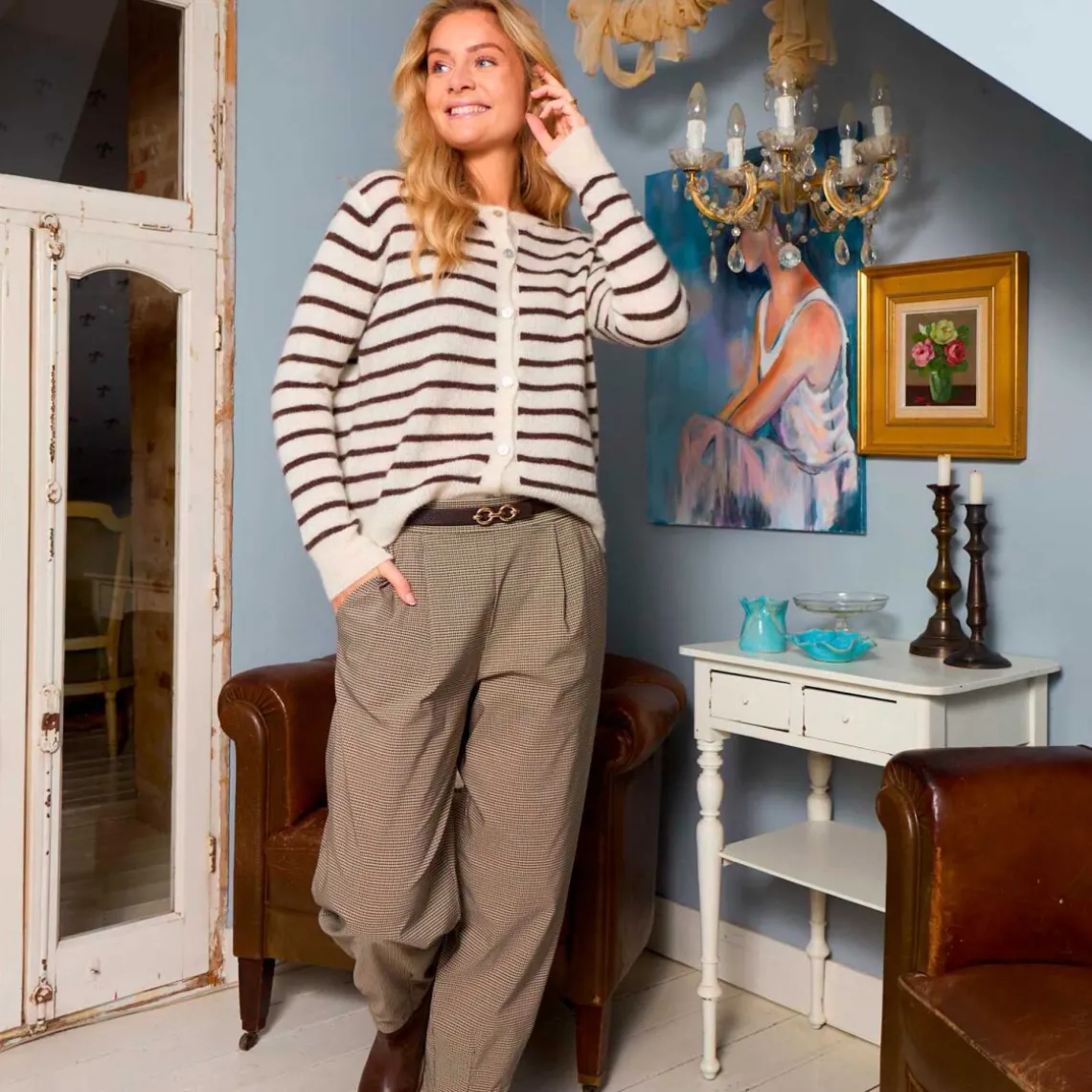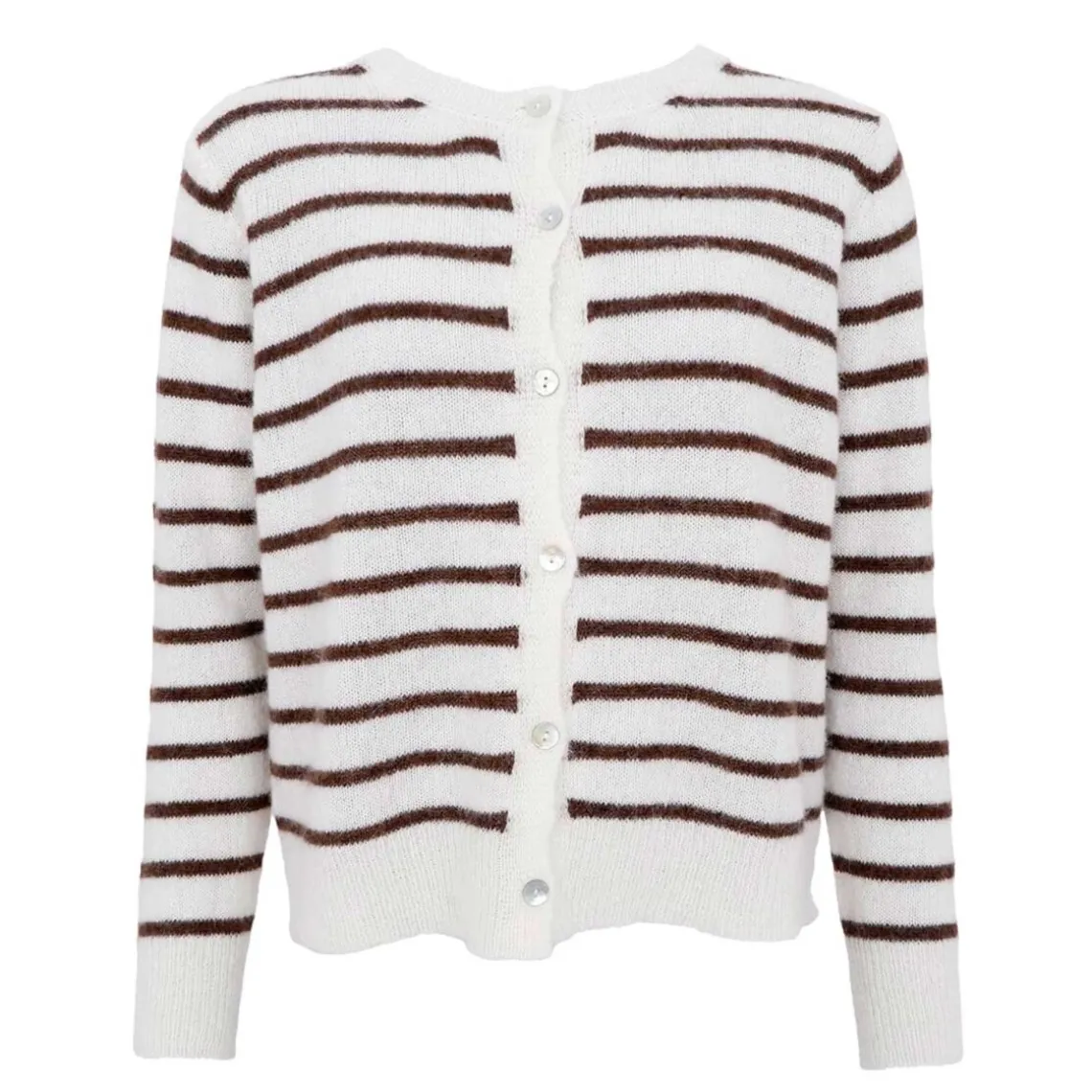 Strikket cardigan med striber i en blød uldblanding, perfekt til lag-på-lag og hyggelige dage. Materiale: 50% alpaca, 28% polyamid, 22% uld