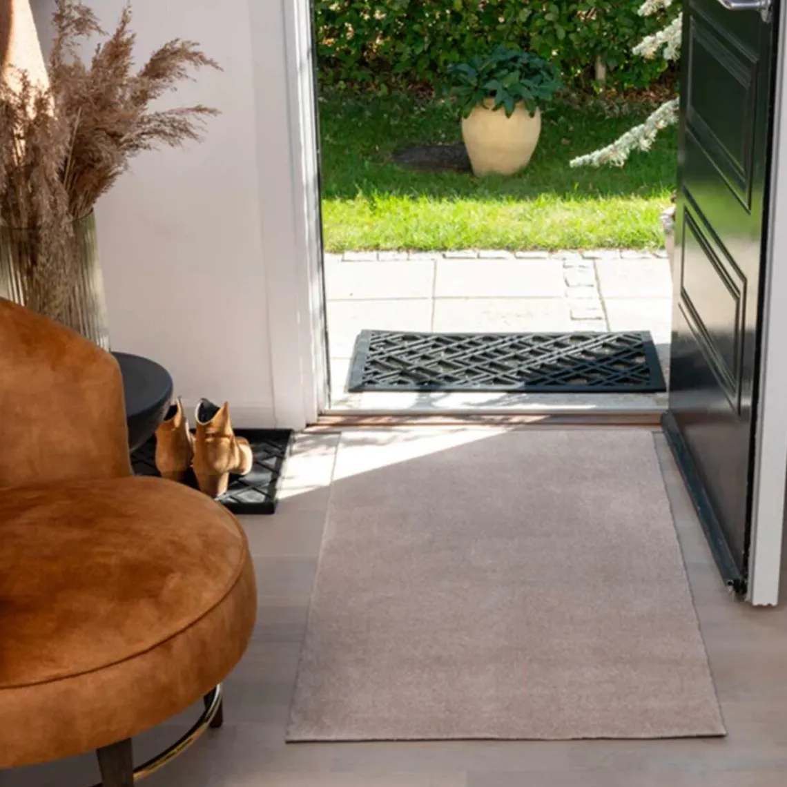 Dørmåtte ensfarvet i sort fra Tica Copenhagen. Tica Copenhagens gulvmåtter og løbere er udviklet i 100% polyamid som har en suveræn slidstyrke samt genrejsningsevne, men samtidig føles meget blød. Bagsiden er en phthalatfri vinyl/PVC som medvirker til at måtterne altid ligger stabile på gulvet uden af rutsje rundt.