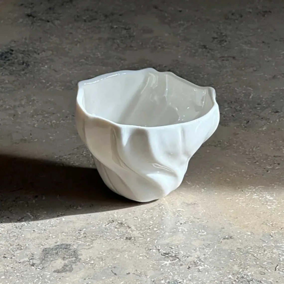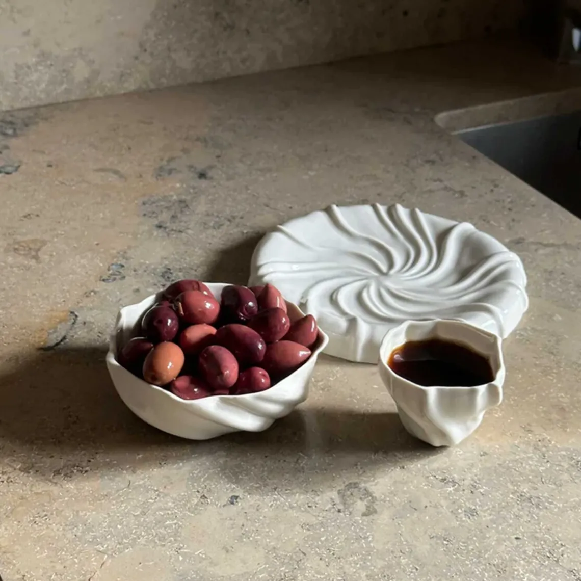 Overfladen er inspireret af den bølgede sandbund, der opstår, når vandet trækker sig tilbage og blotter den nøgne havbund – et sanseligt udtryk fra et særligt og foranderligt landskab. Da hver kop er håndlavet, kan der forekomme små variationer, hvilket gør hver enkelt unik.