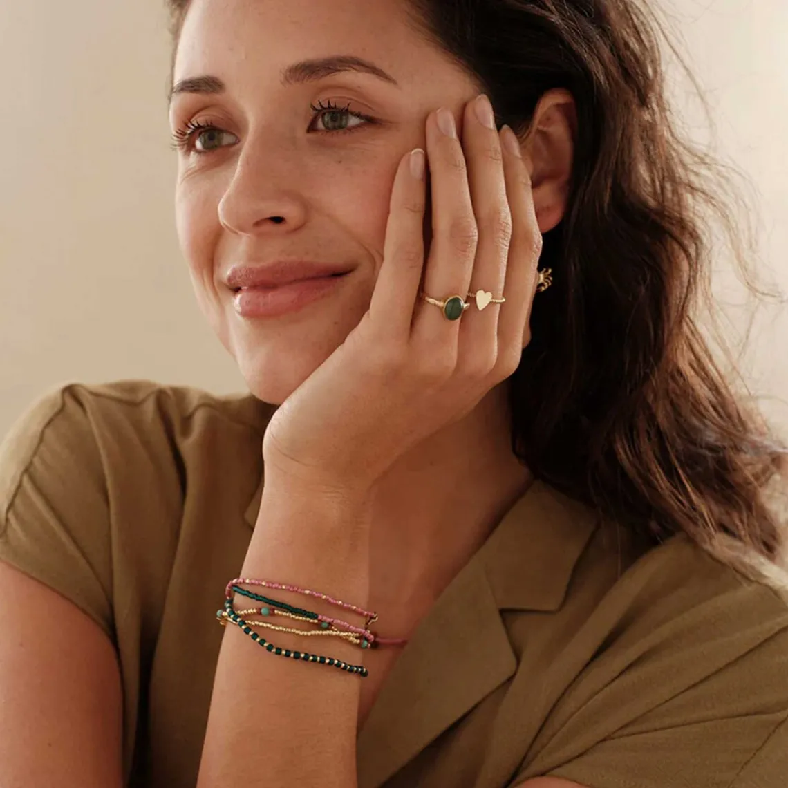 Et elegant og håndlavet armbånd med smukke aventurin-ædelsten og delikate glasperler. Aventurin symbolisere motivation, selvtillid og personlig vækst, hvilket gør dette armbånd til en smuk accessory, der både kan løfte hverdagslooket og fungere som en meningsfuld gaveoplevelse.