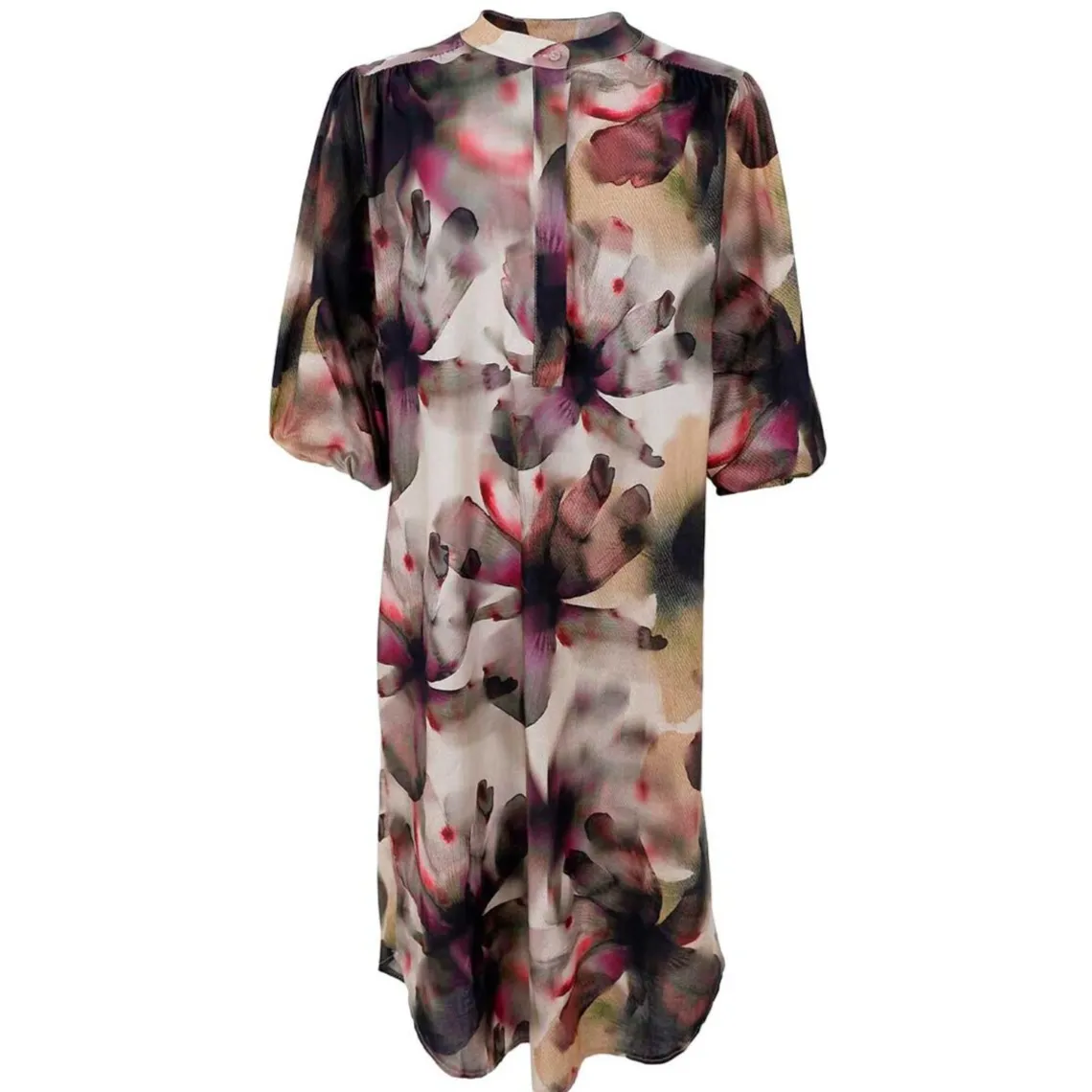 Kjole med blomsterprint, pufærmer og aftageligt bælte. Brug med sandaler for et sommerlook eller med ankelstøvler og cardigan, når det er køligere. Kjolen har pufærmer og et aftageligt bælte. Med bælte fremhæves taljen; uden bælte får du et mere afslappet snit.