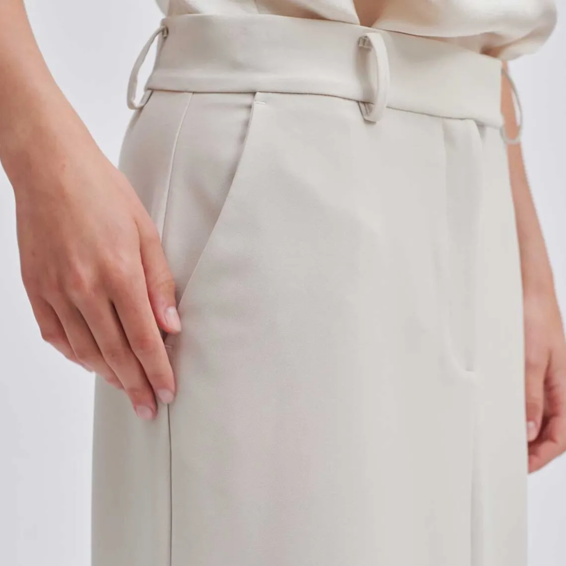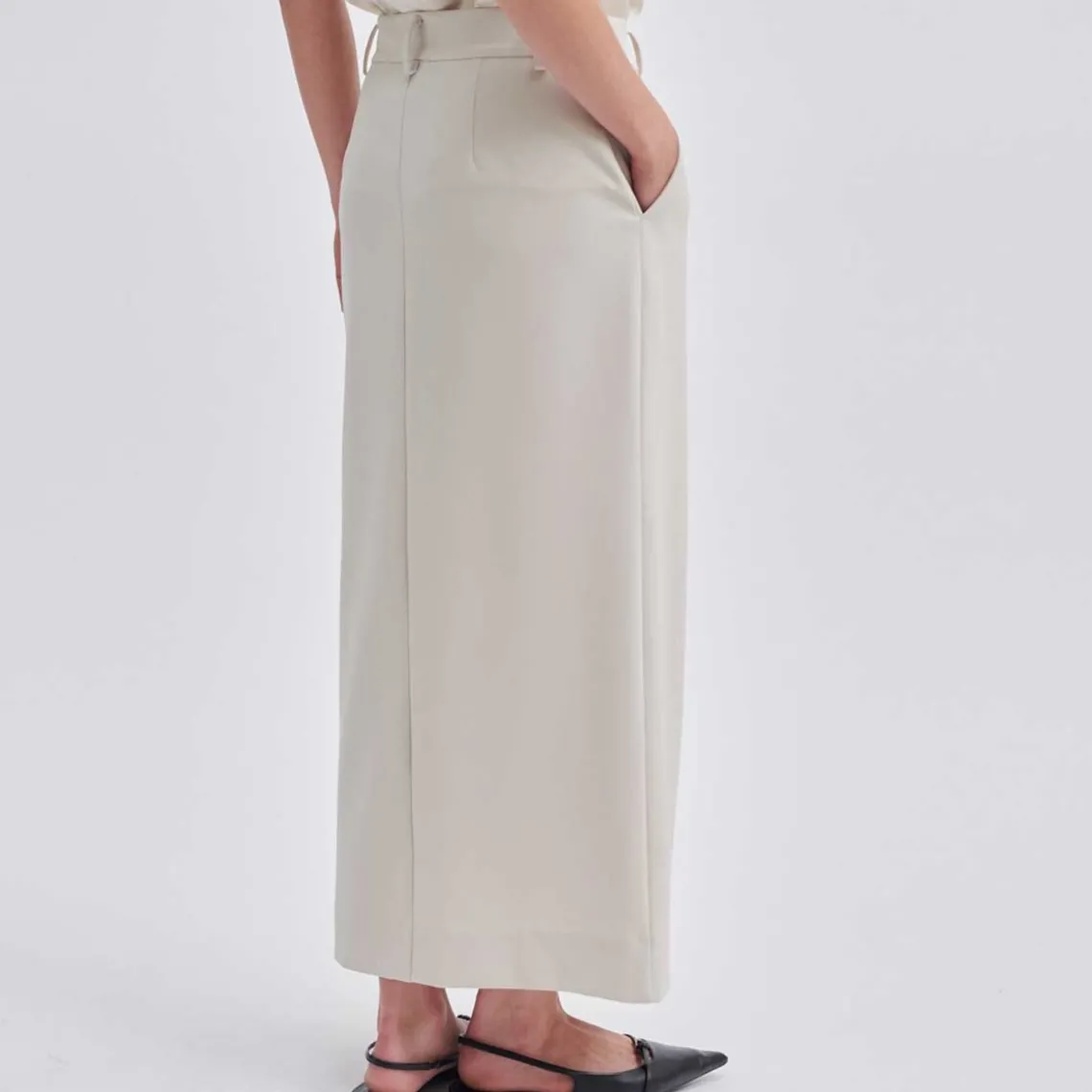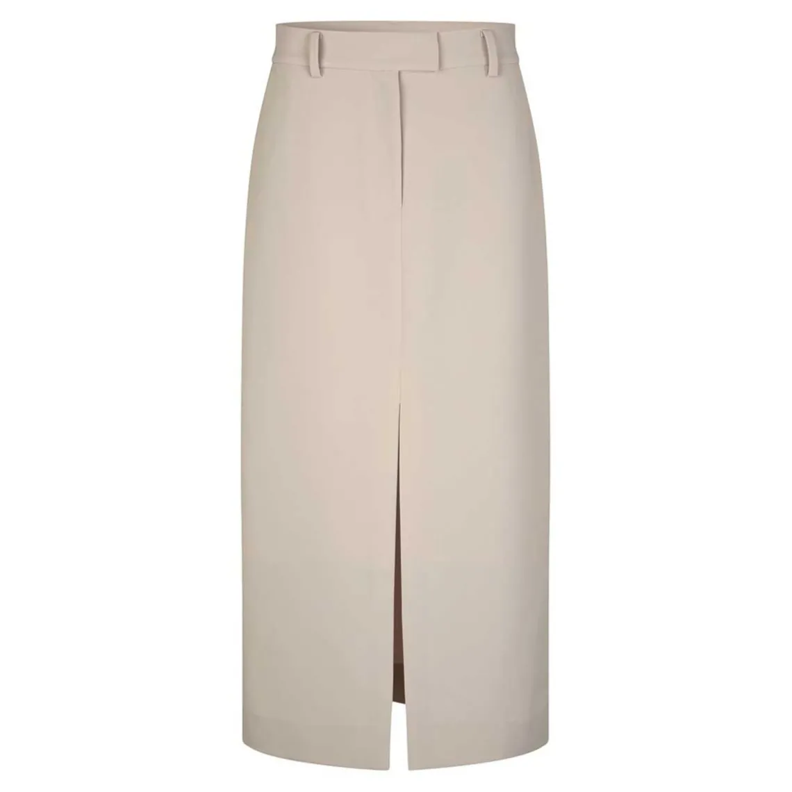 Med skjult lynlås og knaplukning i livet. To skrålommer og dyb slids foran. Figursyede sømme bagpå.