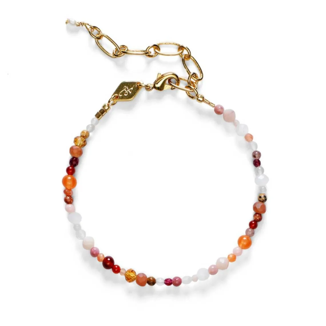 Dette armbånd er detaljeret i glasperler, facetterede glasperler, agat, farvet havbambus, perlemor, rosenkvarts, lyserød opal, jade, aventurin, guldsten, jaspis, granat og dyrket ferskvandsrisperle.