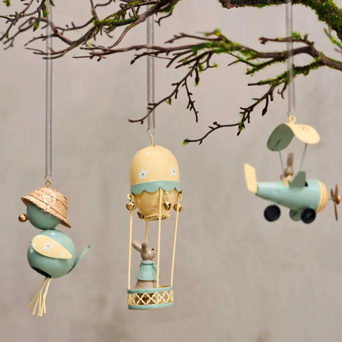Fugl med stråhat i metal med fjederophæng. Sjov og hyggelig påskedekoration.